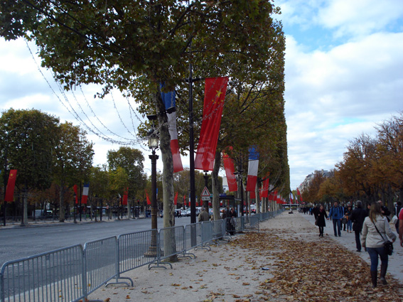 Längs hela Champs Elysée vajade såväl franska som kinesiska flaggor. Kinas ledare  gjorde som vi och tillbringade helgen i Paris.