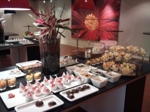 Efter tre dagars skonkost pga. en matförgiftning hade jag i förväg bestämt mig för att ta det väldigt lugnt med maten. Det höll fram tills förmiddagsfikan. Då var juicer och smoothies i glas i olika storlekar och nivåer, från snapsglas och uppåt, uppdukade på spegelbrickor. Bredvid det fanns brickor med små aptitliga smörgåsar, lika vackert upplagda de. Stavar av morötter, gurka och selleri med olika dipp-såser, och så klart kaffe och te. Vattnet serverades i tillbringare med färska frukter.