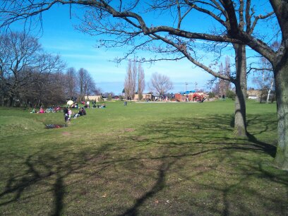 Uppe i Hammars park hade  inte folk hunnit ut än. Några hundvandrare och en man som samlade nersågade grenar. Annat var det förra helgen, mitt på dagen. Då var där fullt av lekande barn och picknickande familjer.