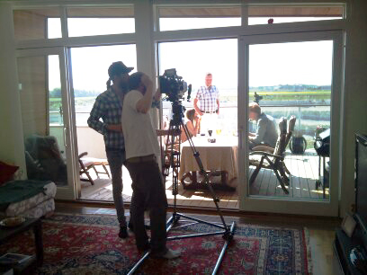 I går kom hela teamet. Förutom att de var laddade med sin tekniska utrustning, hade de även med rikligt med fikabröd och tillbehör.   Rälser byggdes upp, först genom lägenheten, och sedan på balkongen, för att kameran skulle kunna  rulla. Ingen dogmafilm här inte. Kaffe, te bryggdes och dricka hälldes upp. Inte bara för våra att fylla våra magar, utan också som rekvisita.