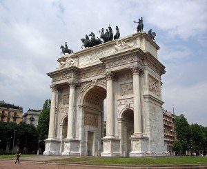 Parco Sempione visade sig vara en grön, vacker oas, nytvättad och frisk av regnet. Vi gick genom den och kom upp till Arco della Pace vid södra ändan av Via Sempione. Denna triumbåge byggdes 1907 för att Napoleon skulle passera genom den när han hälsade på i Milano, men den hann inte bli färdig i tid. Nu gick jag under den i stället.