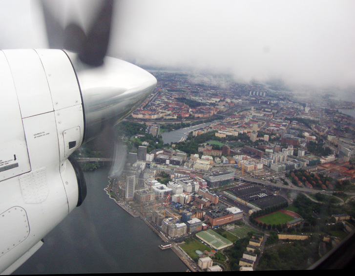 Kvinnan fnös och talade om för mig att detta var ett mindre plan och att jag skulle sätta väskan nedanför trappan upp till planet. Jodå. Det var ett litet plan. En rad stolar på ena sidan och två på andra, gånger tolv. Med propellrar. En SAAB 340. Mannen kör en SAAB 93 och flygplanet var väl gjort i ungefär samma skala; dryga tre gånger större än bilen.