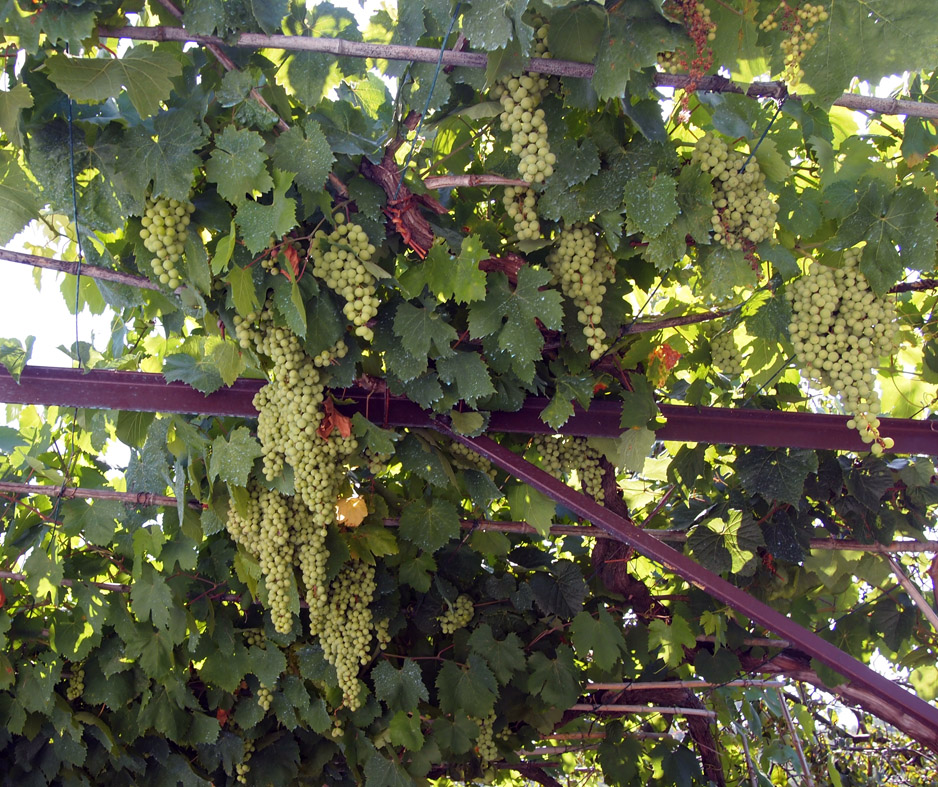 Det växte vinrankor som dignade av druvor på pergolan över parkeringen. Jag kan tänka mig sämre skugga. Lite längre bort stod en äldre man, klädd i bruna byxor och ett vitt linne och slet i grönskan över sitt huvud. Jag gick ur bilen och fram till honom, och han vände sig direkt till mig och undrade, på italienska, om jag visste vad det var för sorts växt han drog i. Det gjorde jag inte. Då visade han mig klasarna av kiwifrukter som hängde lite varstans i grönskan. Så ser inte min ynkliga lilla kiwiplanta på balkongen ut. Än. När jag berättade det gav han mig generöst alla skötselråden, och när Mannen också kom fram frågade mig farbrorn om han visste hur man skötte en kiwi, och jag fick lova att vidarebefordra kunskapen.