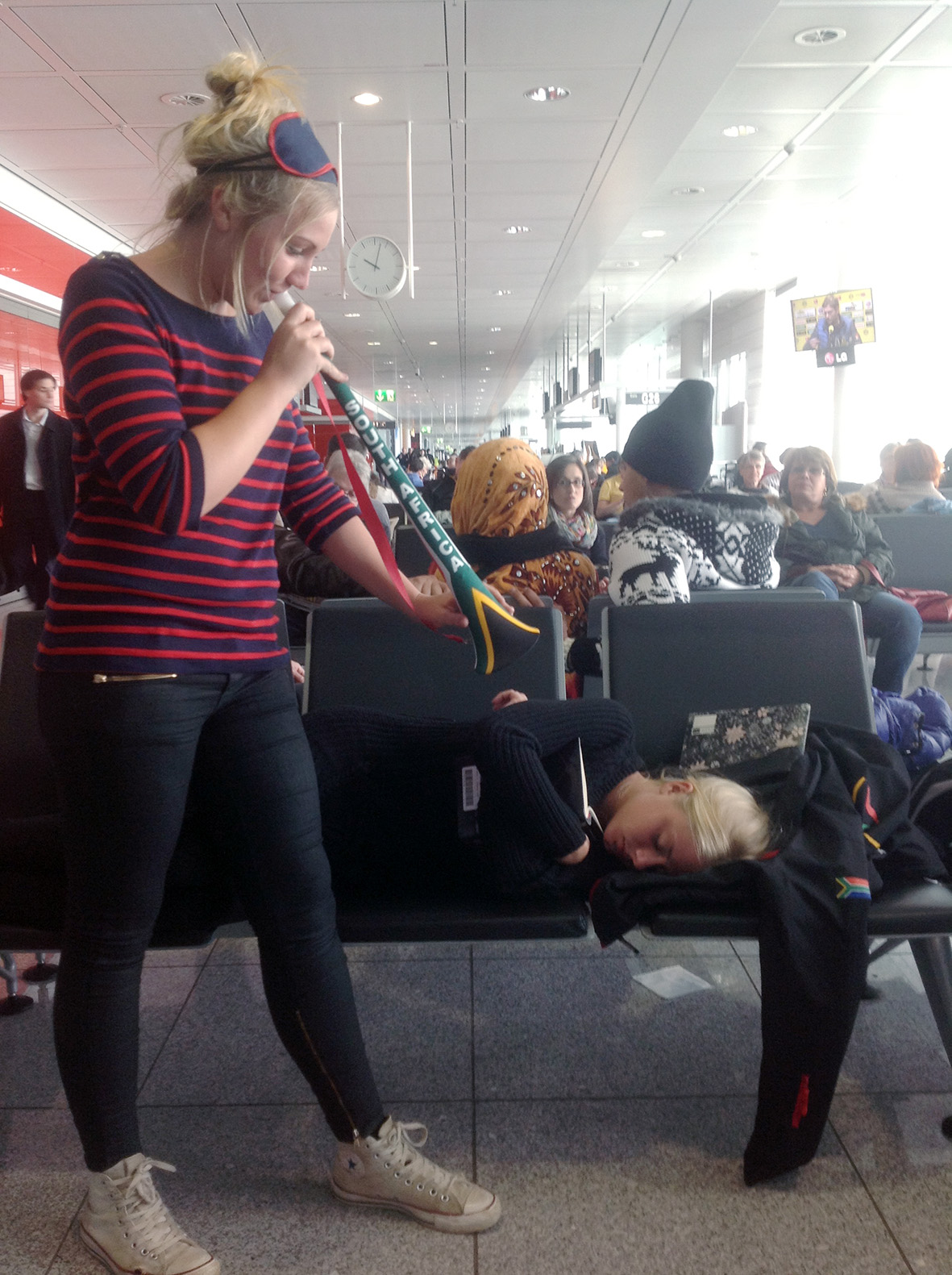 Alla checkade in och tjejerna genomförde en flashmob med körsång på zulu, och den afrikanska personalen i restauranger och butiker kom ut och sjöng med.
