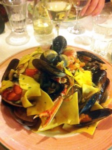 Efter sms-kontakt med väninnan i Sverige hade vi fått adressen till den bästa restaurangen och dit gick vi på kvällen. Osteria Dello Zio Gigi. De har ingen hemsida, vad jag hittat, men ligger strax bakom domen på Via Folco Portinari, och är värd att leta efter. Mannen beställde in Pasta med Frutti del Mare och jag höll på att reta mig fördärvad att jag valt Spaghetti Vongole i stället, även om den var perfekt som sådan.  Sedan tog vi båda Vitello Tonato, och den var också grymt god. Oss emellan har jag bestämt att återvända till Firenze, om inte annat för att äta  Frutti del Mare hos Zio Gigi…