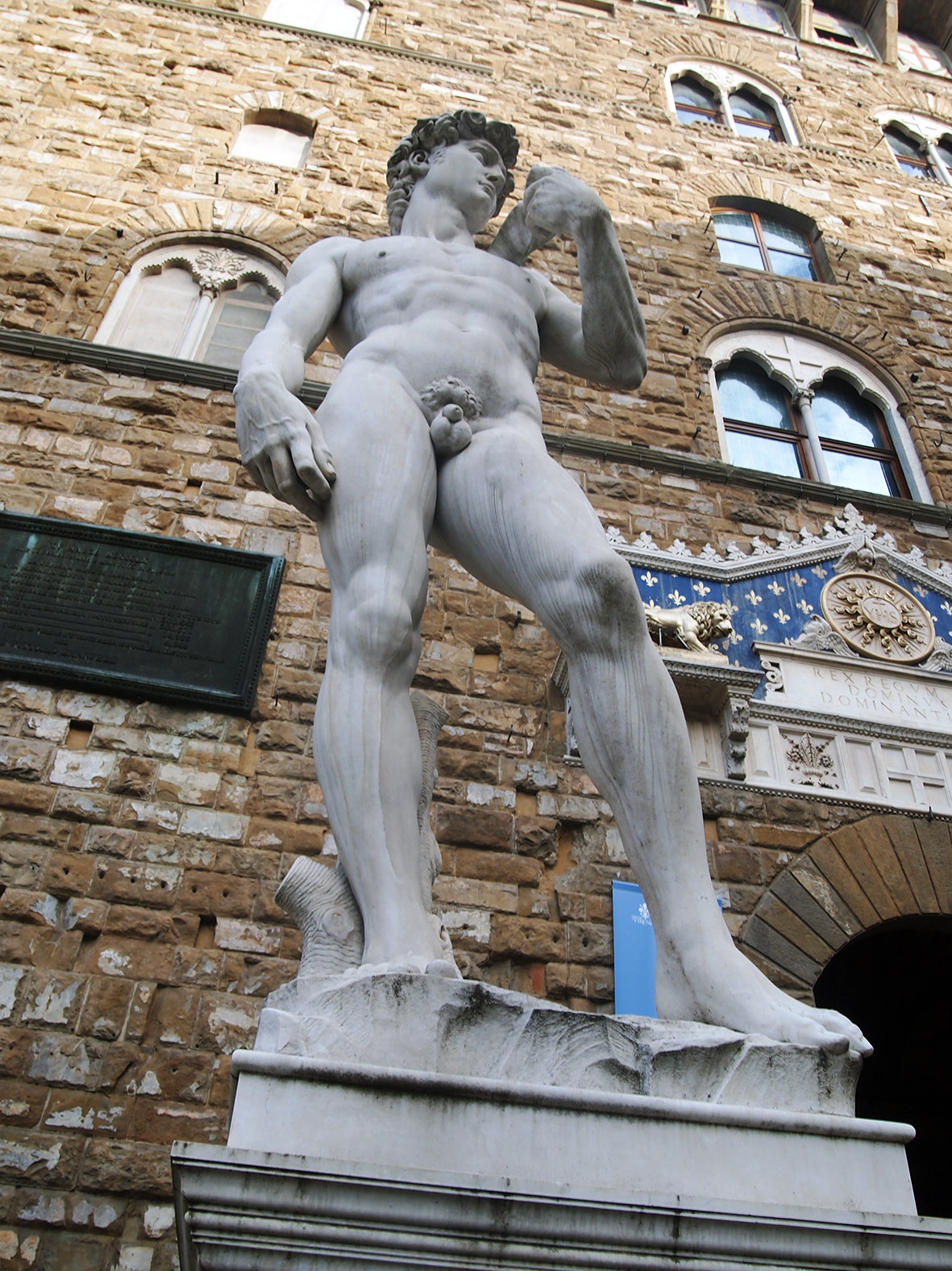 Domen, detta imponerande jättebygge, skulle naturligtvis beses, och sedan var det lunchdags. Det blev en liten servering i närheten av Uffizierna, som vi sedan skulle se inifrån. Vi hade hört att kön inte skulle vara så farlig strax efter lunch. Den var bara en timme, enligt skylten… Jag hade ju faktiskt ont i benet, så Mannen beordrades att stötta mig och så Haltade jag, med stort H, in till biljettbokningen – inte försäljningen. Det slutade med att vi fick bokade biljetter en halvtimme senare. Om det berodde på mitt haltande är osagt, men för skams skull överdrev jag linkadet tills vi var inne.