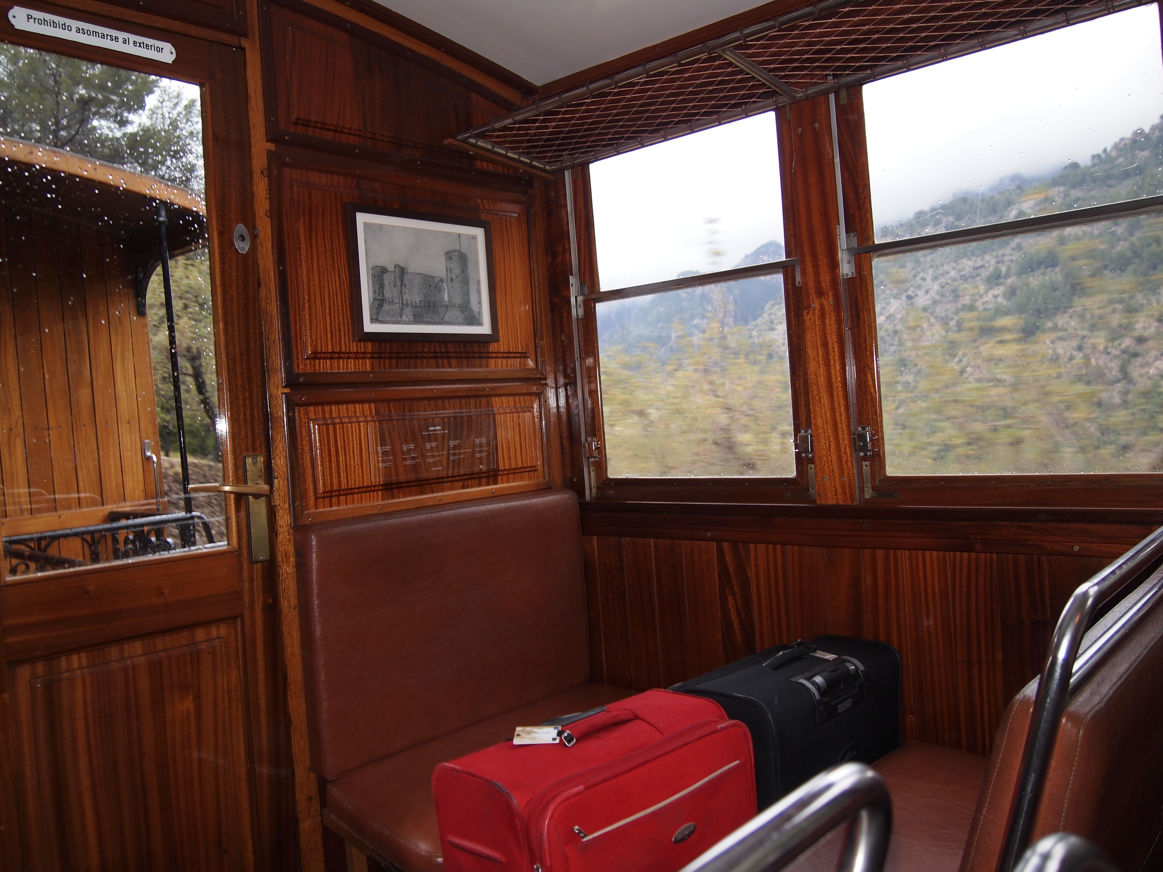 Även om regnet upphört bestämde vi oss för att ta spårvagnen, eftersom den stannade närmare hotellet. Denna gång skulle vi vidare med det hundraåriga tåget ner till Palma. Det är ett otroligt charmigt gammalt trätåg, med teckningar av Miro på väggarna, som tuffar fram genom oliv- och citruslundar, förbi får och åsnor. Ryggstöden på sätena kunde vändas efter vilket håll man ville åka på. Först tänkte jag filma hela turen, men kom sedan på att det nog inte finns någon som hade varit intresserad av att se den filmen. Jo förresten, en, men jag beslöt ändå att låta bli.