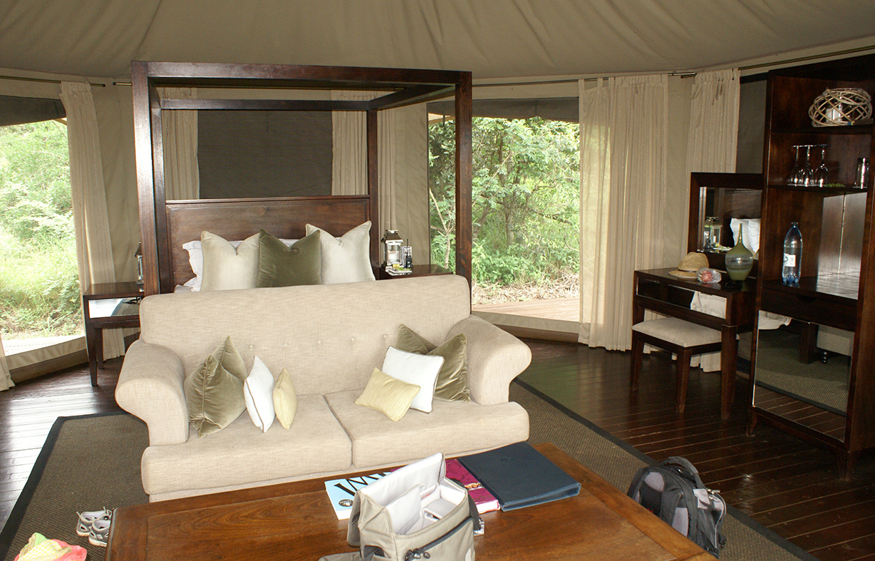 Vi kom fram till Thandas grind och vi och våra väskor lastades över i öppna jeepar och kördes ut till det nybyggda tented camp där vi skulle bo. Vårt – och alla de andras – tält höll måttet. En rejält tilltagen säng, garderober och ett stort badrum och dessutom även en dusch utomhus.