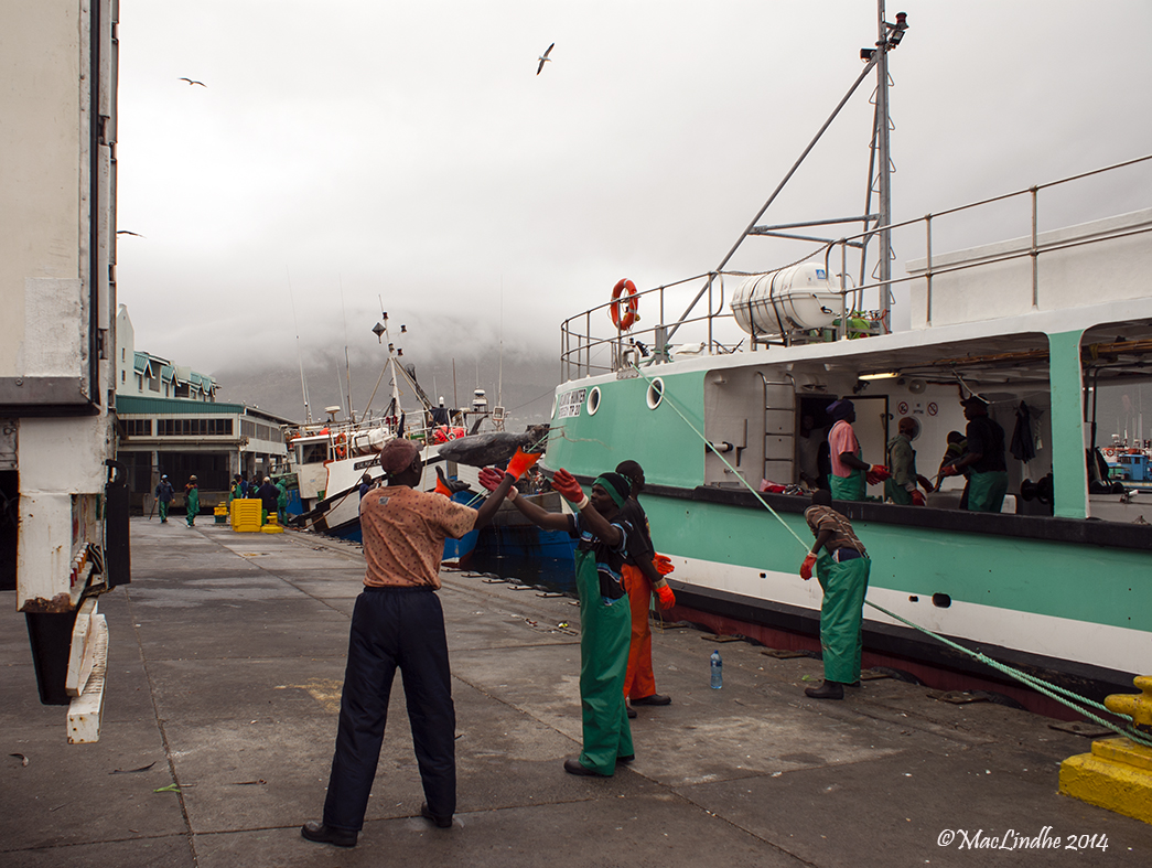Något annat fascinerande i Hout Bay var lossningen av fisk. Man bildade kedja och kastade fisken från båten, via ett antal män in i lastbilen.