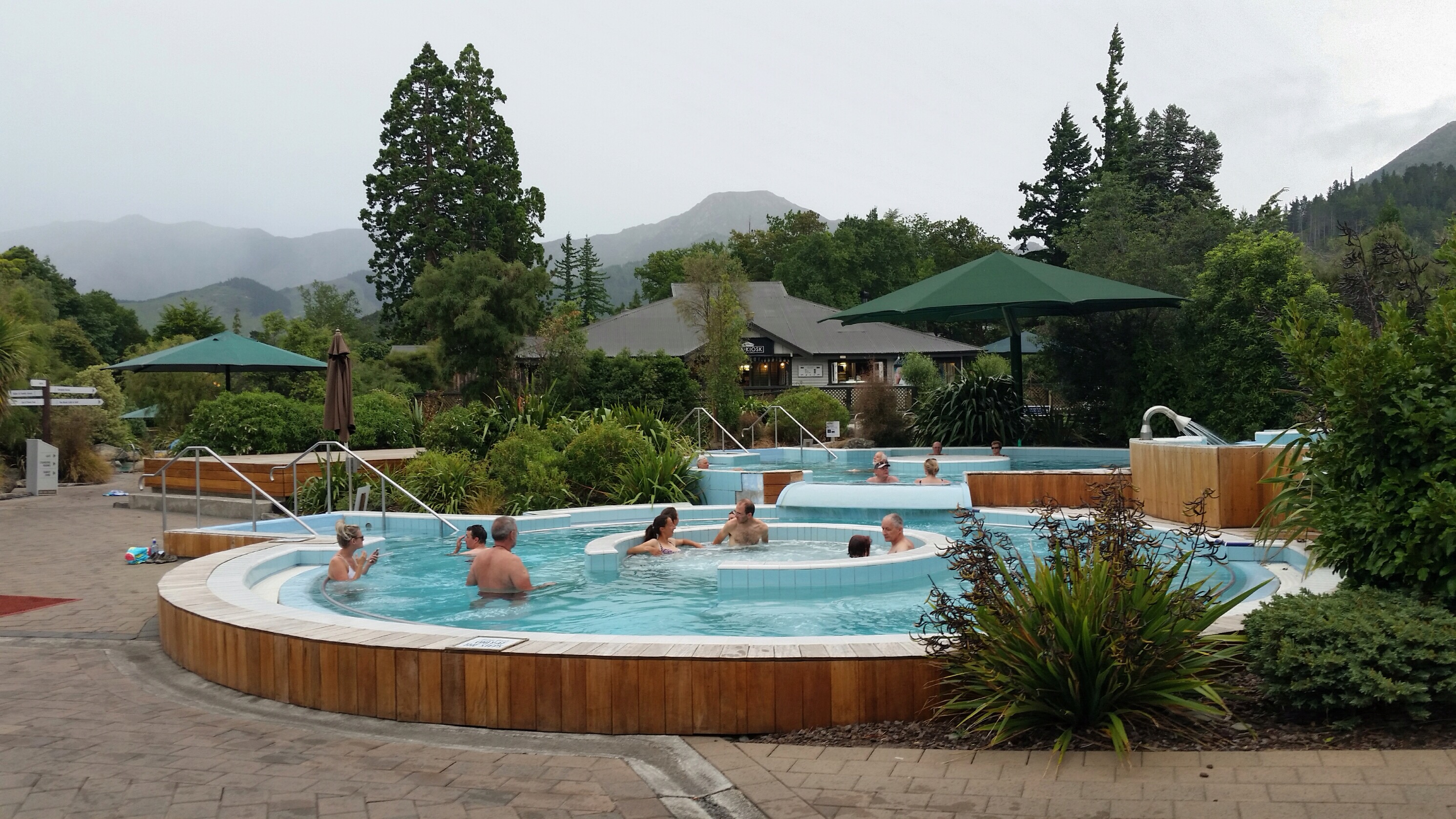 Ingenting fick lämnas i omklädningsrummen. Utanför fanns låsbara skåp man kunde hyra för 2 NZ-dollar. Det gjorde vi och alla andra turister. Mannen hörde någon lokal förmåga undra varför alla utlänningar gjorde så, och slösade med pengarna. Det fanns ju öppna fack gratis bredvid.
