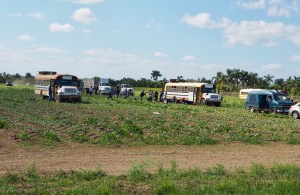 Vägskylt i Everglades State prisons working följt av ett gäng svarta män i orange overaller.