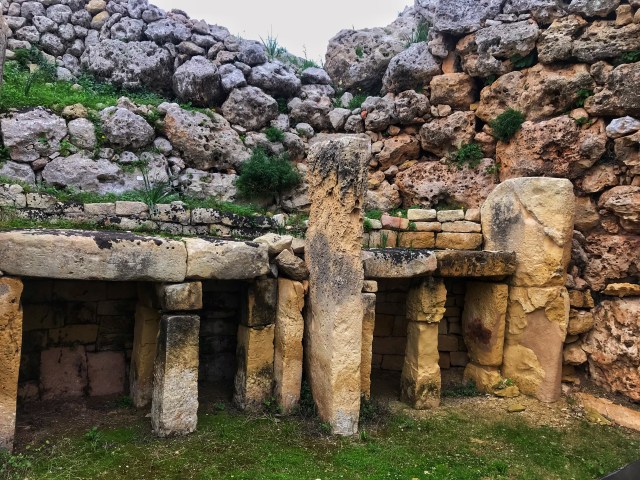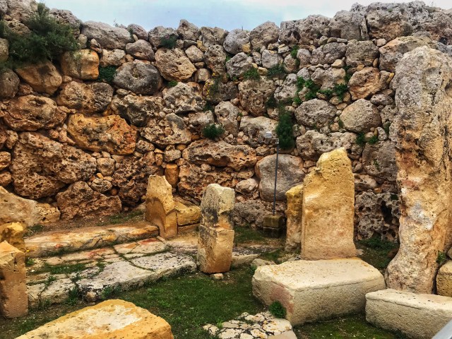 Ggantijatemplet (say after me, please) är över 5500 år gammal, mer än 1000 år äldre än pyramiderna i Egypten. Det är lika obegripligt här hur man lyckats få dit de ofta enorma kalkstensblocken som bildar väggar upp till 42 meters höjd. Att de dessutom hade möbler i sten är än mer imponerande. Vi talar alltså om stenåldern då gemene man klubbade ner något som kom i vägen och släpade hem till grottan.