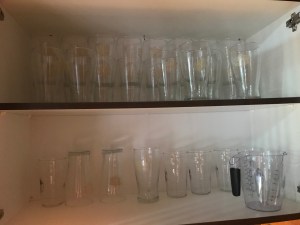 När vi skulle duka och ta fram glas till vårt medhavda vin upptäckte vi att skåpet innehöll 29 Murphy ölglas, plus 11 ölglas från en pub. Det var allt i glasväg.