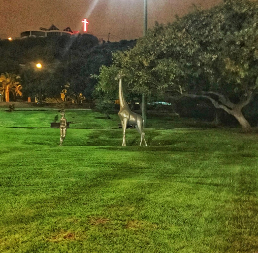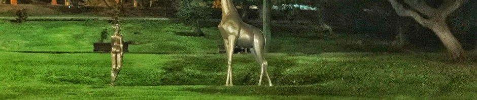 I går kväll när vi följt vår värdinnas rekommendationer och ätit på en helt fantastisk peruansk restaurang och gick hem, passerade vi parken och såg en giraffstaty där inne. Jag plockade upp mobilkameran, som var allt jag hade med då och gick in i parken. Det var mer är giraffen där. Tydligen är parken även ett populärt ställe för herdestunder. Det var mer än ett par med bokstavligen byxorna nere som blev lätt störda av en girafftokig svensk dam med mobilkameran i högsta hugg.
