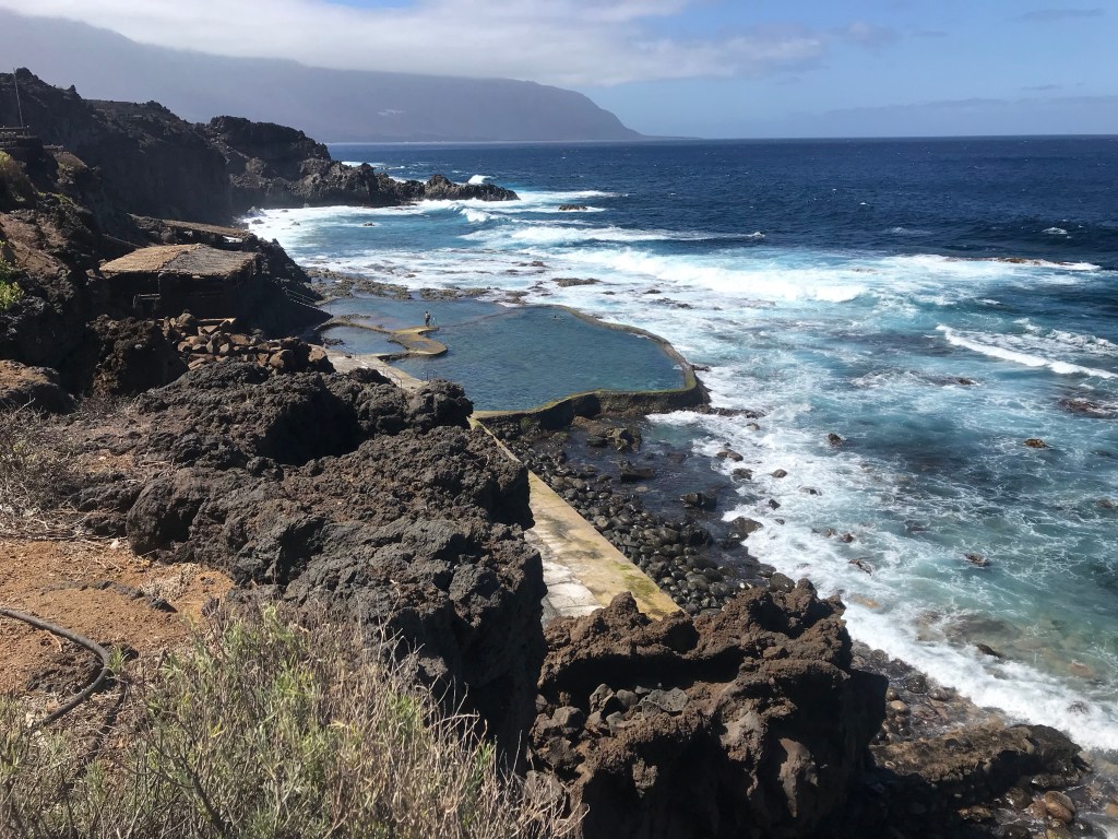 Så blev det och vi fick en härlig timme. Man har byggt ”bassänger” vid den steniga Atlantkusten. Ingen risk att strömmarna drar ut de badande i vilda havet, däremot slog vågorna över och duschade samtidigt. Tyvärr hade vi inga badkläder med, så det blev bara lite fotbad. Dessutom var det glashalt så räfflade badskor hade varit att föredra.