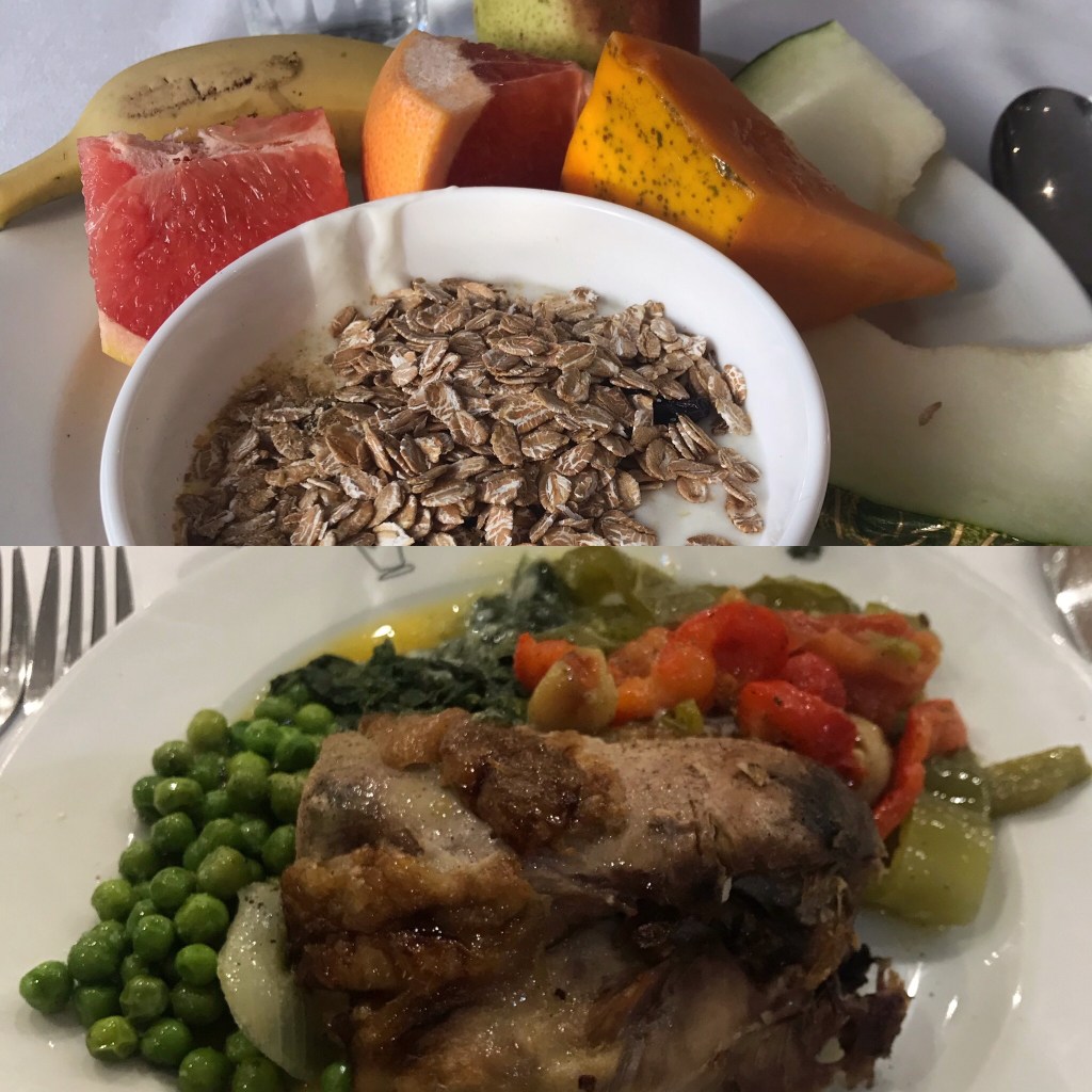 Den största anledningen till att vi återvänt hit så många gånger är maten. Många all-inclusivehotell har ganska sunkig buffé, medan de här alltid har någon speciell rätt varje dag. I går kväll var det stekt anka med apelsinsås, som jag tog varma grönsaker till och avslutade med några bitar ost och färsk frukt. Kunde definitivt vara sämre!