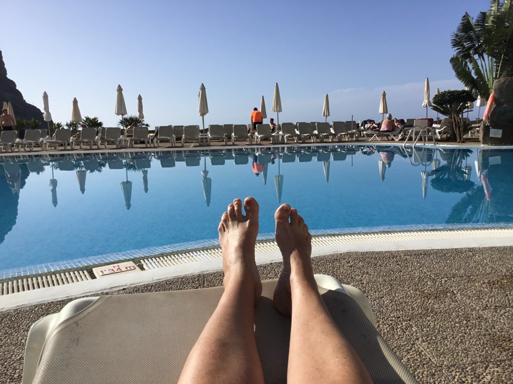Tömma ryggsäckarna, dra på badkläder och ner och få lite mat i magen och fukt i strupen innan vi landade i var sin solstol. Åtminstone jag somnade tämligen direkt och vaknade av att min äkte hälft stänkte vatten på mig.