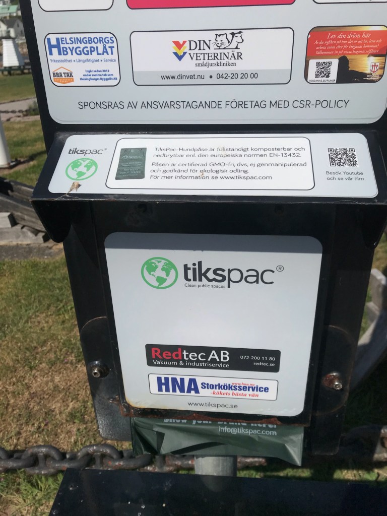 Vårt hotellrum på Pensionat Strandgården har balkong ut mot havet. Perfekt för en konferensfika på eftermiddagen. Det var nämligen konferens på hotellet och värdinnan sade att när konferensdeltagarna tagit sitt kunde vi också ta kaffe och paj. Perfekt! Vi hämtade var sin bit och tog upp på balkongen och högg in. Jag smakade direkt att det var rabarberpaj och stoppade Mannen. Han tål inte rabarber och bleknade när han hörde var han redan hade hunnit svälja. Men, det finns lösningar på allt. Nere vid hamnen finns gratis hundpåsar att plocka upp med, om det krisar under morgondagens vandring till Höganäs.