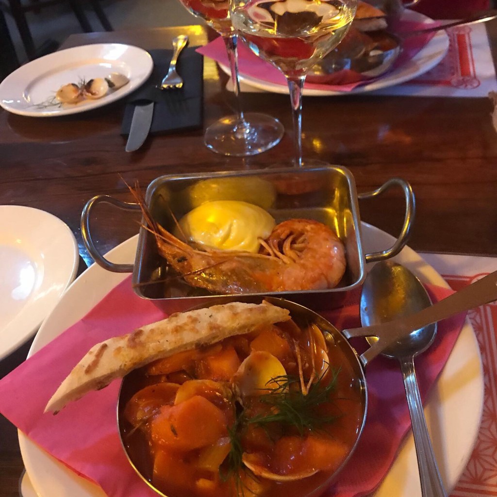 På kvällen hade vi bokat bord på Restaurang Fjällripan , en liten lagom promenad upp på berget. Chef där är Alexander Nilson som, för dem som följer alla TV-kanaler, är känd från Kniven på strupen och även någon svensk variant av Arga Kocken. Det har mindre betydelse, för mat kan han laga, och hittills är det resans bästa måltid med först Boulabaisse och sedan kyckling med kantarellrisotto och friterad rosmarin. Mums!