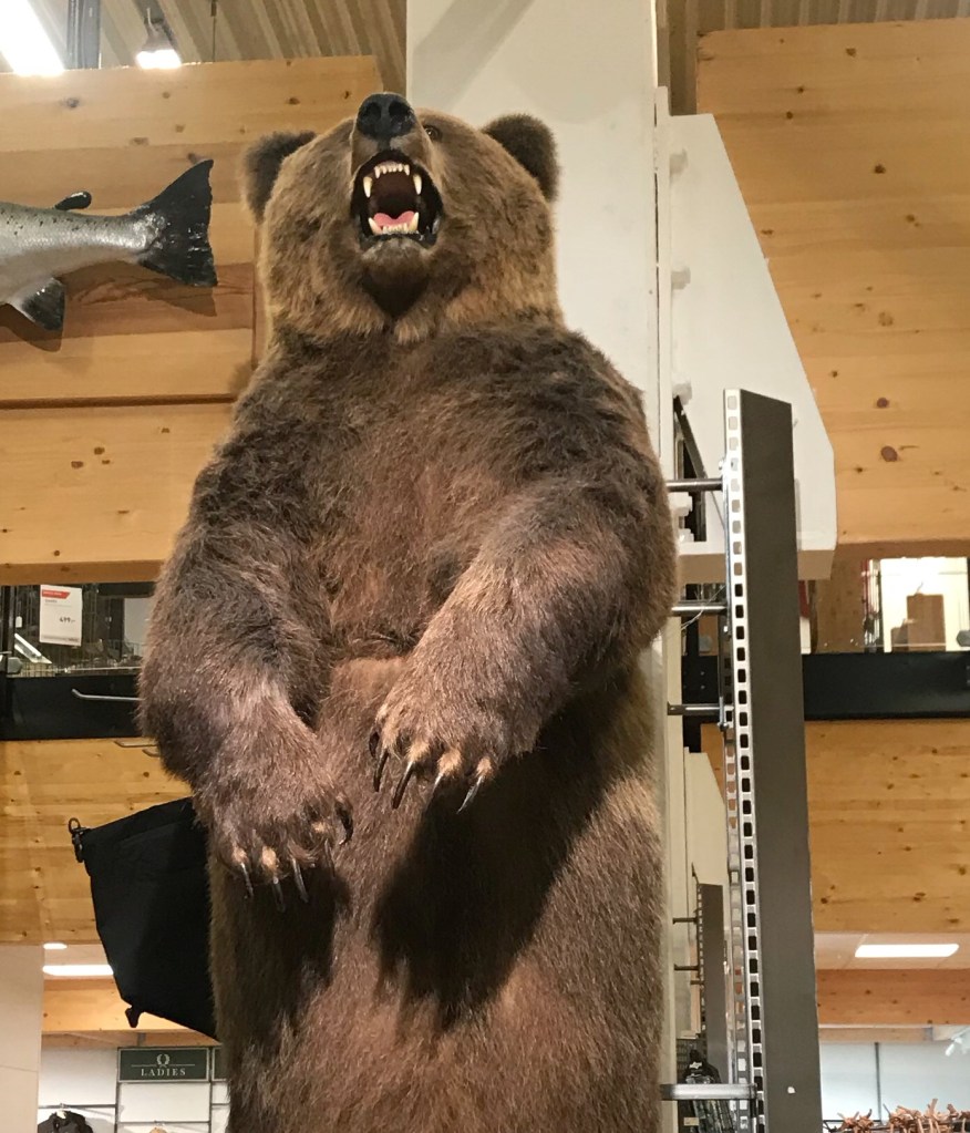Då jag inte har sett en endaste björn, ren, älg, eller varg, bara en förskrämd iller på hela resan kände jag mig tvingad att fotografera den uppstoppade björnen de har i Kosta Outlets jakt- och sportavdelning. Bredvid Per Morberg, som dock bara var utskuren i papp och inte uppstoppad, så honom fotograferade jag inte.