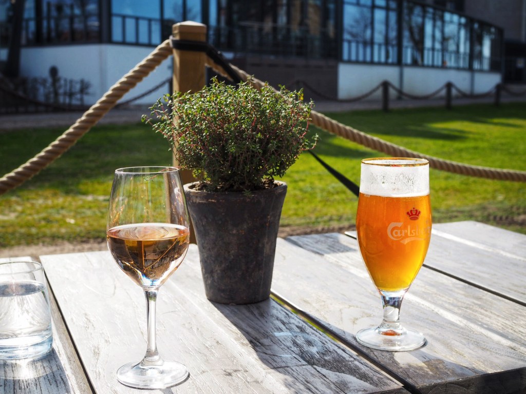 Googles karta visade på en Ica supermarket i Båstad, bara cirka fem km promenad bort, och jyckarna skulle ju ändå rastas och solen sken så… Efter att ha gått mot trafiken på 70-vägen en bit blev vi nyfikna på ett glassigt nybyggt område och sneddade genom. Och fick klättra ut över ett stenröse på andra sidan innan vi hamnade på Skåneleden 1/Kattegattsleden och följde den mellan havet och blommande vitsippsängar in till Båstad. Vi hade en del diskussioner om vägen, och jag kände mig nödd och tvungen att bjussa Mannen på en öl på Pepes Bodegas uteservering i Båstad för att han skulle inse vem som hade rätt. Jag fick ett glas rosé och hundarna en skål vatten så alla blev glada.
