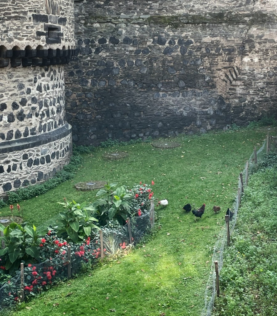 Om Andernach kan man säga att de låtit det gamla vara kvar och byggt nytt som smälter in. Vackert! Människorna är vänliga, pratar nästan bara tyska och tar bara kontanter! Många fler rökare än hemma och väldigt många unga mammor. Den gamla borgen har höns istället för korpar som pickar runt muren.