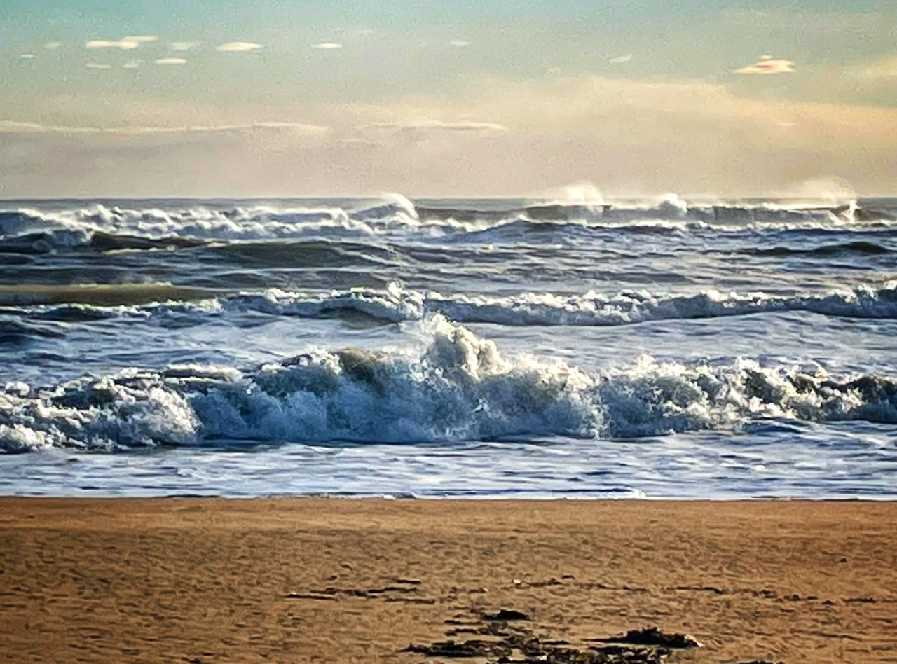 Själva samhället är relativt öde. Massor av tomma restauranger och butiker, förmodligen i pandemins spår. Stranden är lång och fin, vågorna höga, men fortfarande för kallt att bada. Enligt mig i alla fall. Det är nog ovanligt kallt här i år, men i lä och sol varmt, så jag har lagt av vantarna nu.
