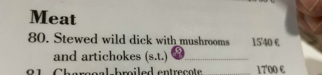 Det kändes tvunget att påpeka stavfelet för den oförstående servitrisen. När jag pekade på ordet och frågade vad det var kvackade hon som en anka för att förklara. När hon fick veta vad det stod trillade hon först ihop, sedan kastade hon sig över menyerna och slet till sig alla på engelska.