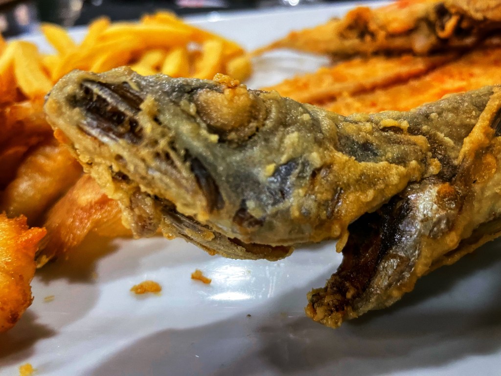 Efter dagens gapskratt som aptitretare åt vi först en otrolig sallad till förrätt och friterad fisk som varmrätt.