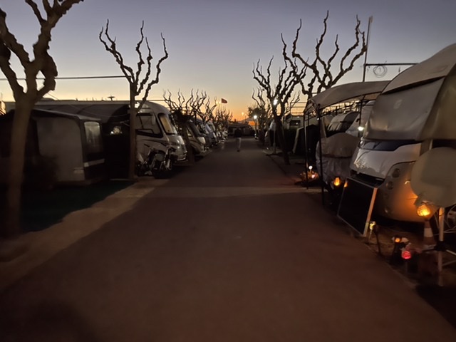 Det var inga problem att hitta dit, och de mötte oss vid ingången till Bahia camping. Vi valde en plats som såg bra ut på kartan och körde in i gångarna enligt anvisningar. För att uttrycka det milt är det ingen lätt plats att komma in på, längst ner på Gräddhyllan som gången kallas. Ett antal av de boende där var engagerade och vinkade in oss på plats, samtidigt som blomkrukor, solcellslyktor och cyklar fick flyttas för att det skulle gå. Det gick!