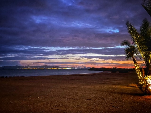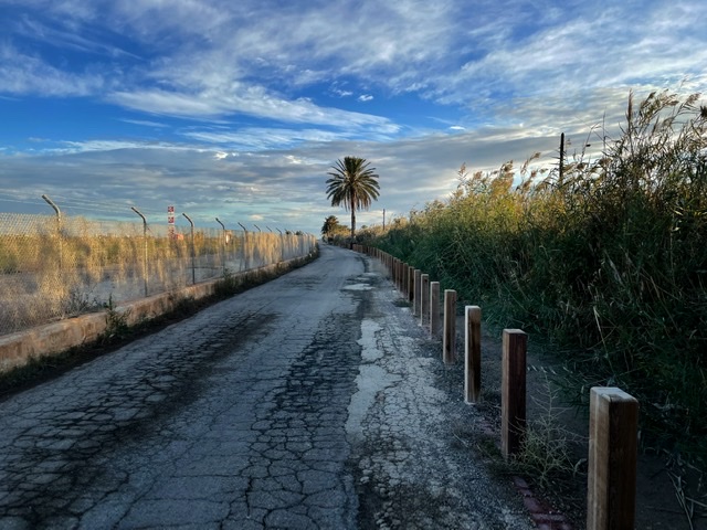 På ena sidan, cirka hundra meter bort har vi stranden och havet. På andra sidan, lite närmre, start- och landningsbanan till ett militärt flygfält där de tränar start och landning med små jetplan som landar, kör en liten bit på banan innan de drar på för fullt igen och går upp i en åtta innan de återvänder och börjar om. INTE VÄSNAS?!