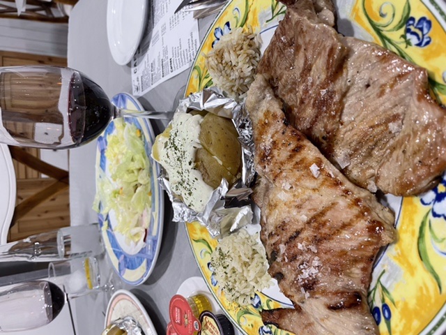 Vi var fortfarande mätta vid åttatiden, men tänkte att något lite måste vi väl ha i oss för att inte vakna mitt i natten och vara hungriga. Så vi lämnade hundarna i bilen gick runt hörnet till en liten kvarterssylta, där det satt fyra lokala gubbar och ljög med var sitt glas rödvin. När vi kom in öppnade personalen upp dörren in till finrummet, dvs riktiga restaurangen med dukade bord och brutna servetter. Det där att bara ta något lite gick inte så bra. Salladen visade sig vara en middag bara den, och den grillade pluman var himmelsk. serverad med bakad potatis och ris. Jag åt hälften av min portion, Mannen slickade tallriken.