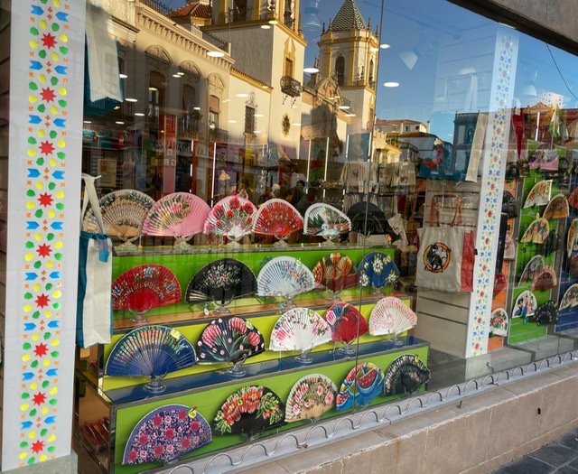 En tur bort till den gamla tjurfäktningsarenan och Puento Nuevo med utsikten, sedan började vi gå tillbaka på gågatan med massor av affärer. Hittade en affär med bara solfjädrar. Vilken önskedröm det hade varit när jag hade som värst vallningar!