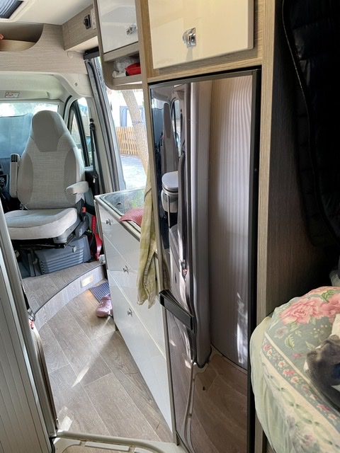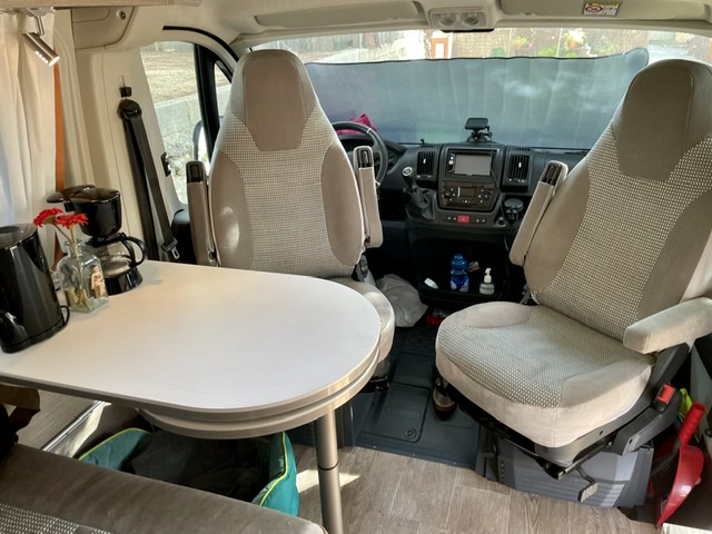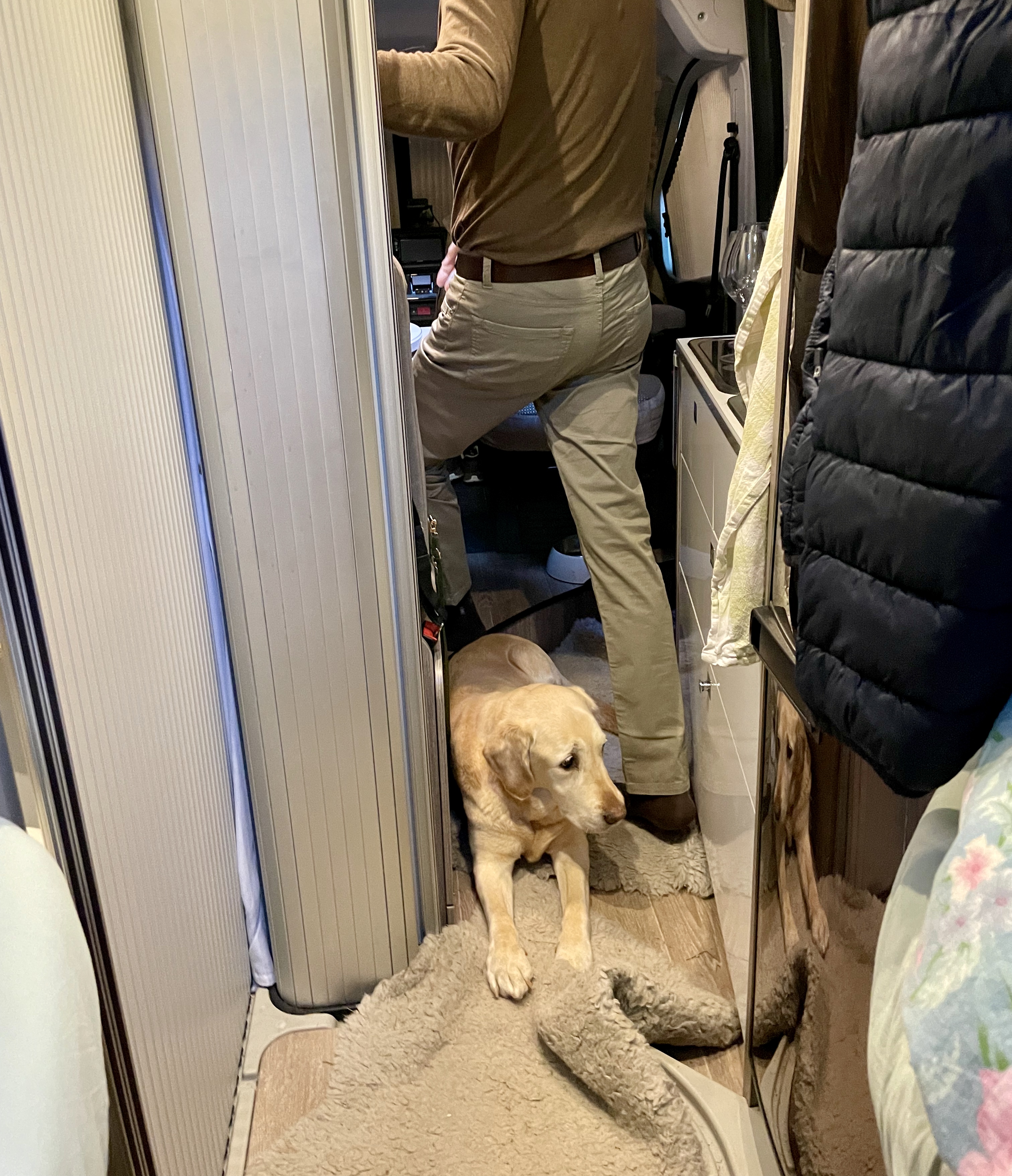 Nu har vi snart bott fyra veckor i husbilen på den här resan, och jag vet att många undrar hur i all världen det fungerar. Och om det fungerar. Jo, det gör det. För det mesta riktigt bra, även om jag ibland blir tossig på att det är så trångt. Definitionen på hund är något ludet som alltid är i vägen. Multiplicera det med två, och dela med en liten plåtis, och lägg till två fullvuxna människor så fattar du.