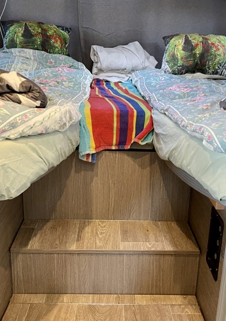 I bakre delen av bilen, den så kallade bodelen har vi två längsgående sängar med fack ovanför på båda sidorna till våra kläder. Det finns även en halvhög garderob under en av sängarna. I mitten har vi bäddat med ett badlakan till Siri. Selma sover på fällar på golvet. Vi sover alla väldigt gott!