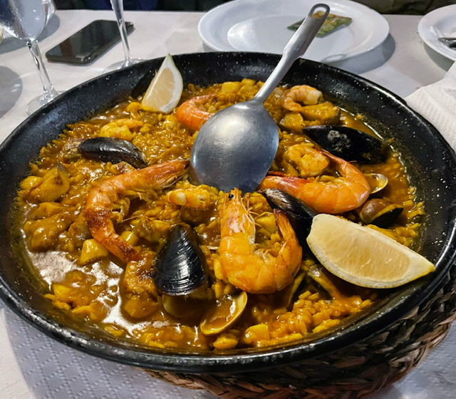 Måltiderna intas utomhus, om vi inte hittat någon trevlig restaurang i närheten. I går, innan regnet, gick vi ner till stranden till en restaurang som serverade en underbar paella.