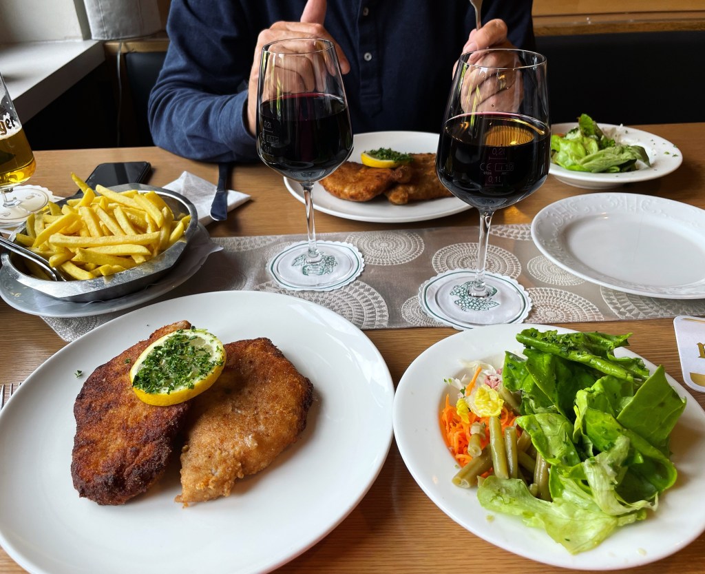 Till slut hittade vi alla fall rum på en liten vingård strax utanför. Perfekt! Och värdinnan tipsade om ett annat ställe som serverade middag. Vi dreglade vid blotta tanken på en wienerschnitzel och beställde det. Jo… vi blev serverade två rallarportioner, två stora schnitzlar var, plus sallad och pommes till. I vår hunger glömde vi båda att våra magar inte längre är vana vid kött från fyrbenta djur, numera äts det högst en dag i veckan och då liten mängd. Magarna påminde oss hela natten.