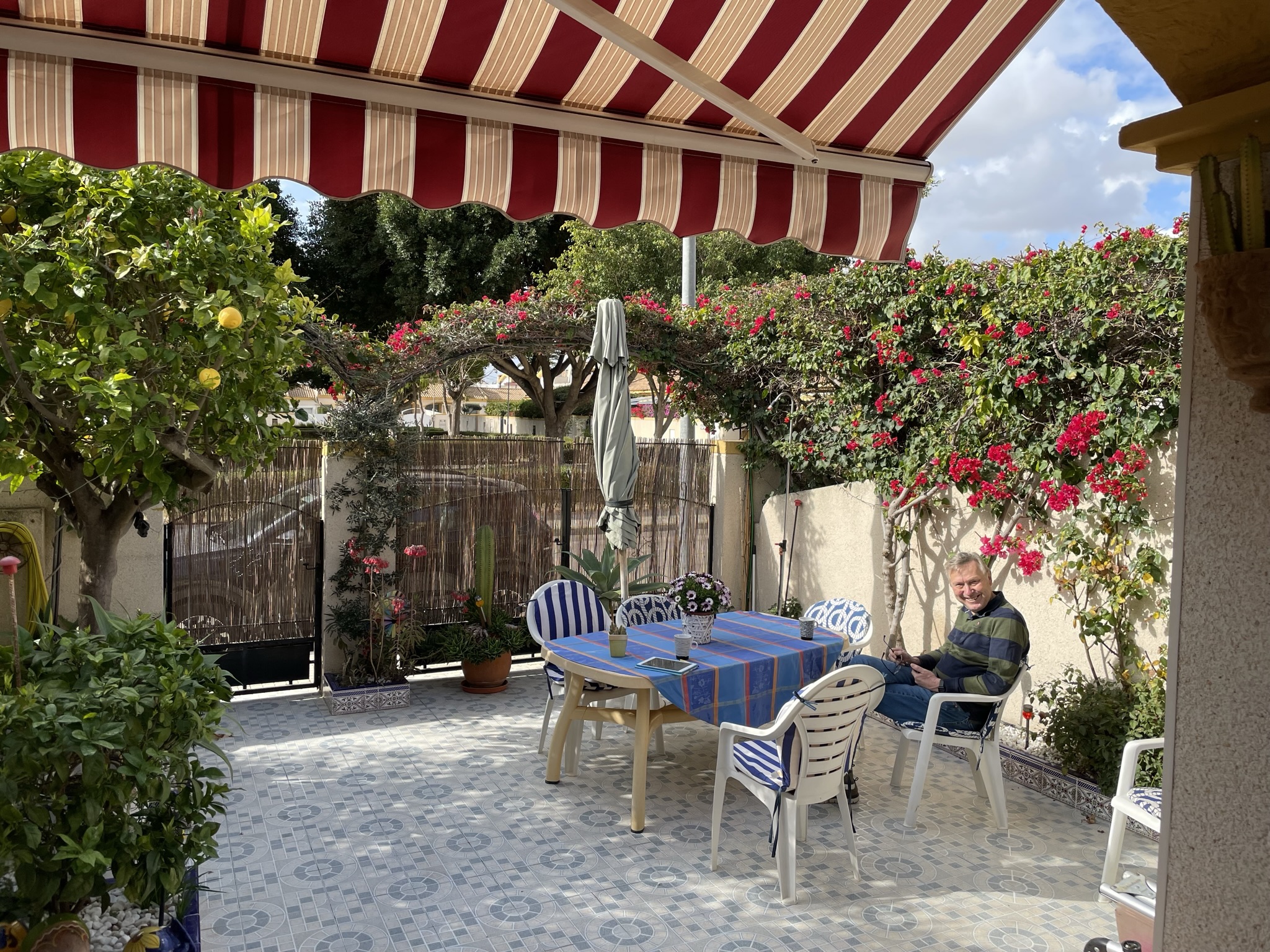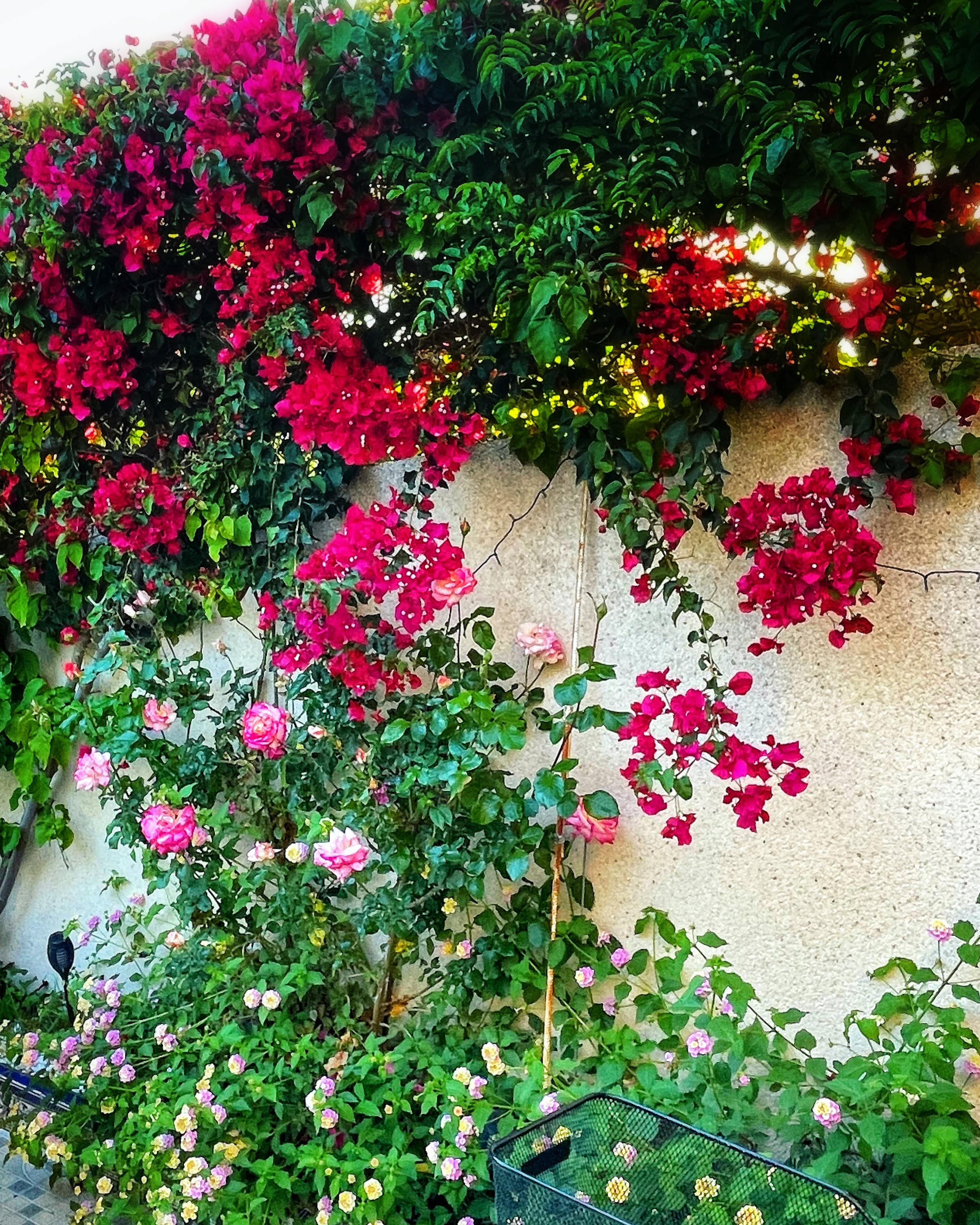 Det kändes som att komma hem igen! Bougainvillean prunknar, nu i sällskap med rosor och något annan växt jag inte definierat än, de sista citronerna hänger kvar, och de första apelsinerna är små och gröna. Jasminen har börjat blomma och doftar underbart.