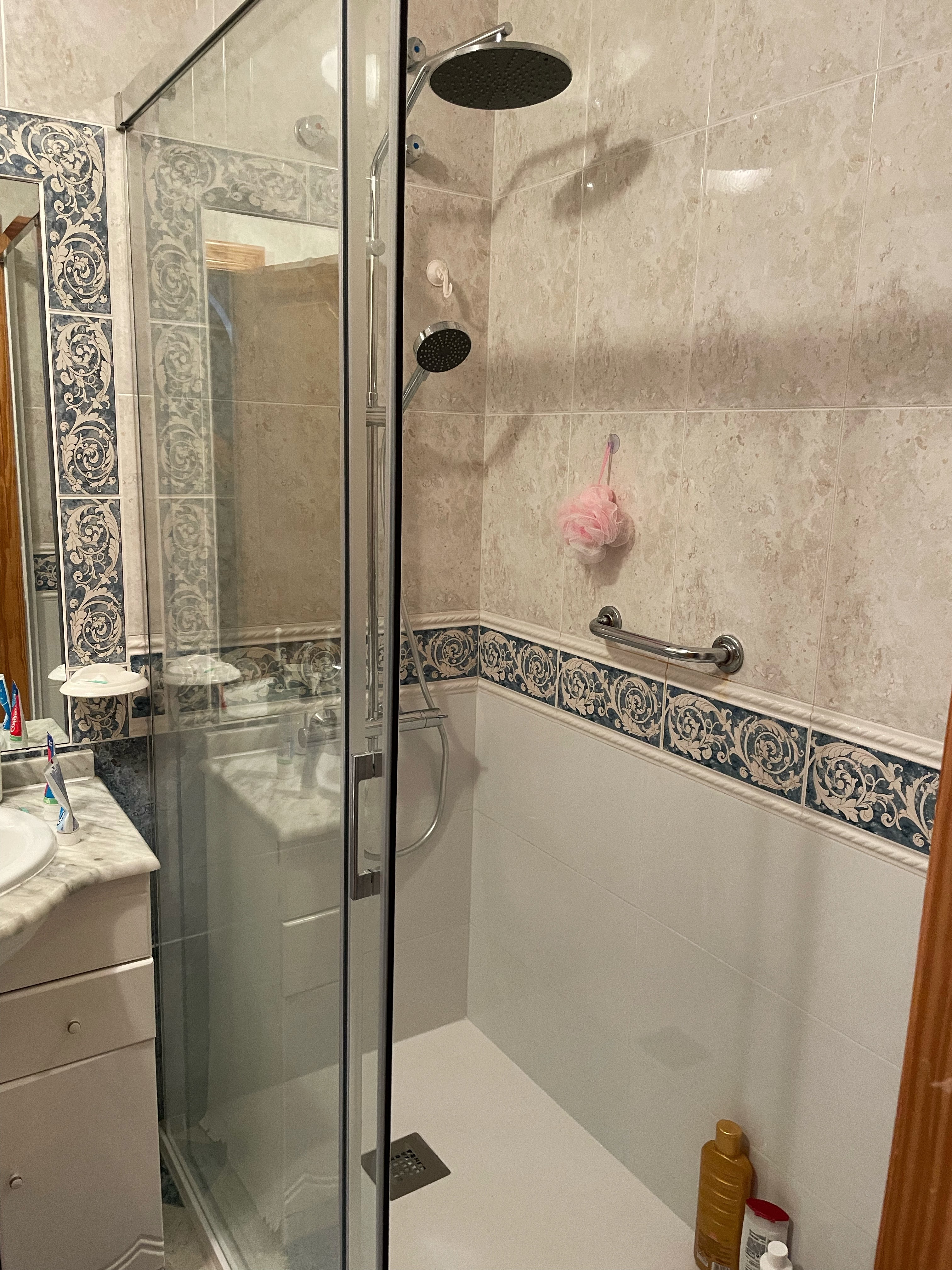 Inne i huset var badrummet och köket klart, jättefint. Med tanke på mitt tråkiga ben är jag så glad att det inte är badkar nu utan en stor dusch att gå in i, och att allt som behövs finns på våning ett.