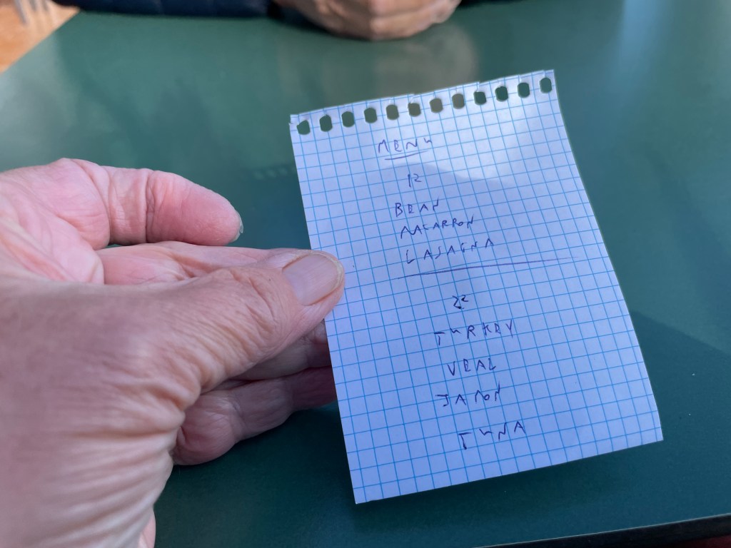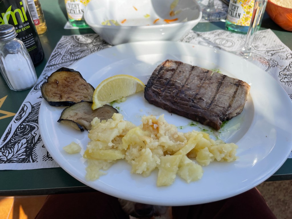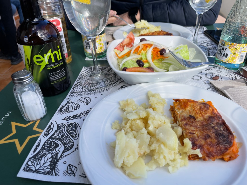 Dagen efter kom vi äntligen iväg till Jumilla. Framme i själva staden var vi hungriga och hittade en restaurang med uteservering i solen, där hundarna kunde vara med. Det fanns en skylt med Dagens meny för 12 €. och servitören, som förresten likande Spike i filmen Notting Hill, (han som var inneboende hos Hugh Grant och som hittade Julia Roberts i badet), både till utseende och kroppsspråk, kom med en handskriven lapp. Valet föll på lasagne och sedan tonfisk. Lasagnen bestod av två lasagneplattor hopklibbade med något rött, och tonfisken var så välstekt att den inte gick att äta. Till båda rätterna serverades kokt krossad potatis. Men salladen var OK.