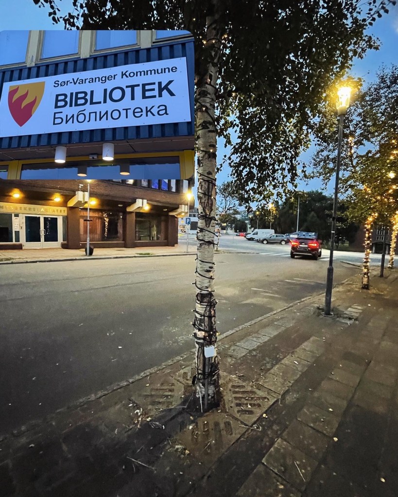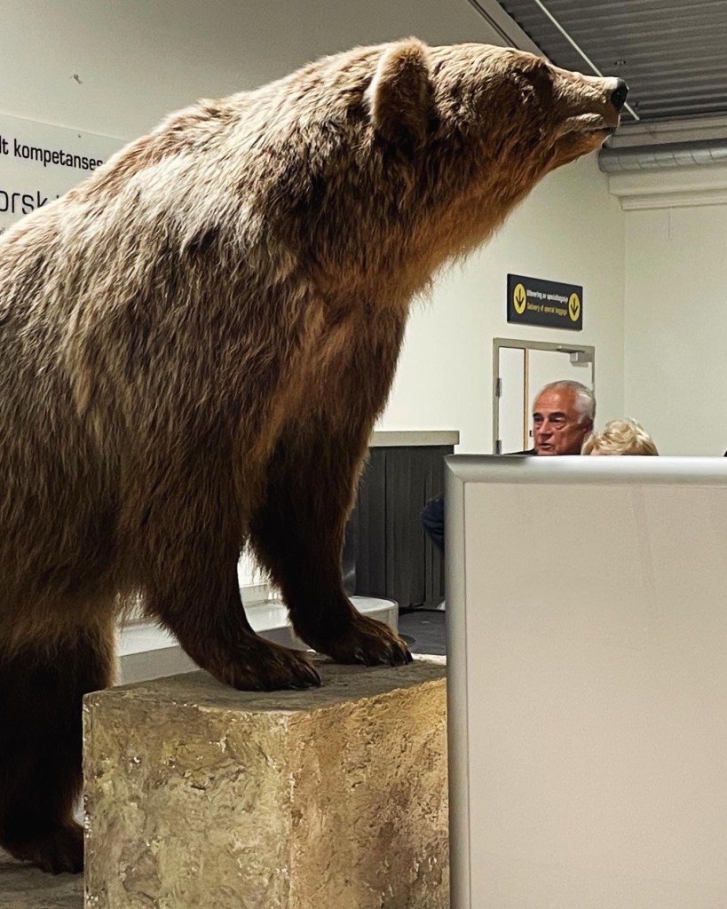 Men vi kom till Oslo och gick genom flygplatsen till nästa plan, där vi fick tre säten själva, och landade drygt två timmar senare i Kirkenes. Landningsbanan när vi tagit mark var vacker. Vatten, björkar och blånande fjäll vid sidan. En liten flygplats med ett rullband vaktat av en uppstoppad björn, där våra väskor kom som de skulle (vi borde köpa en lott, sade Mannen som blivit av med många väskor när han jobbade i Oslo och veckopendlade dit)