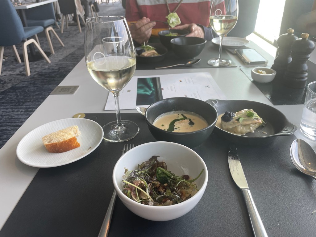 En annan trevlig sak är att man blir placerad vid ett bord, tillsammans med andra som åker parvis, och under måltiderna hittills har vi lärt känna ett spanskt par från Madrid, ett norskt från Tromsö och ett skotskt från trakterna av Aberdeen. Många skratt och väldigt berikande!
