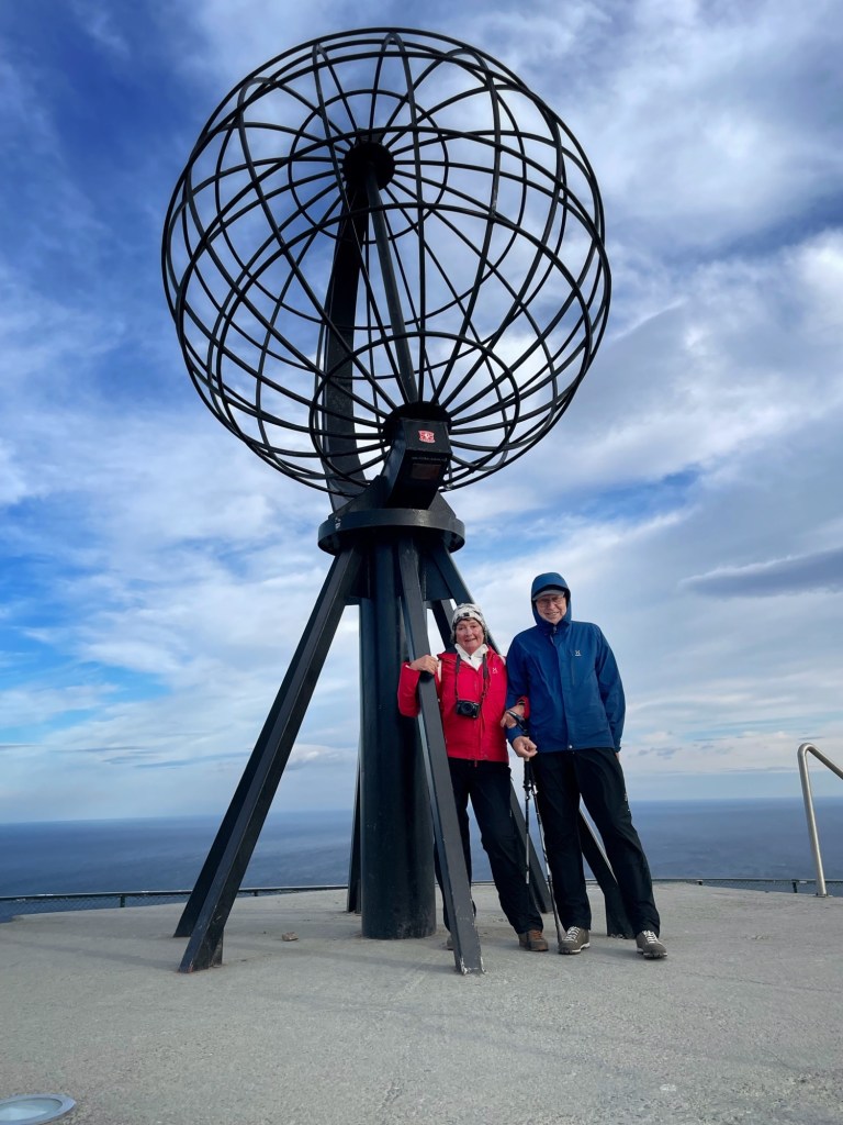 En tidig kväll, följdes av att väckaren ringde kl 05.00 för vi skulle på utflykt till NordKapp där vi började med frukost. Goda grannen Ingrid där hemma hade sagt att vi skulle ta mössa med, och den behövdes! Ganska varmt, cirka 17 grader, men det blåste rejält. Fördelen med att vara där tidigt var att vi var rätt ensamma där då. På vägen ner från Nordkap, mot Hammerfest där vi steg ombord igen, mötte vi många bussar på väg upp.
