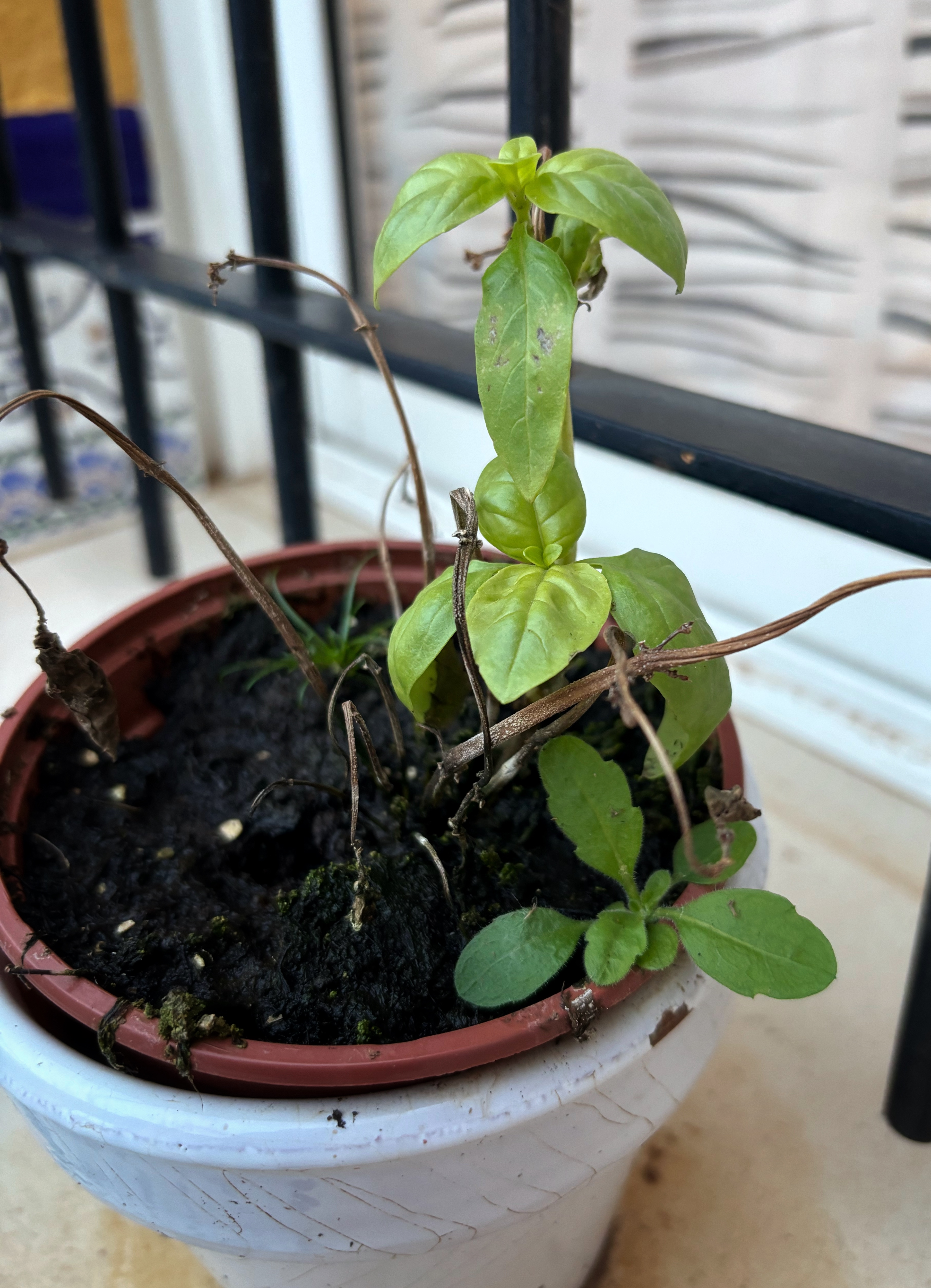 Det nödvändigaste handlades i affären på vägen hem, där vi efter brunchen städade både ute och inne, luftade, satte på värmen och satte in ett element i sovrummet. Innan vi åkte till Sverige i november hade jag satt en vissen basilikaplanta i fönstersmygen på baksidan, för vidare transport till soporna, och sedan glömt den. Det hade den tydligen mått bra av för den har börjat växa där i sin ensamhet.