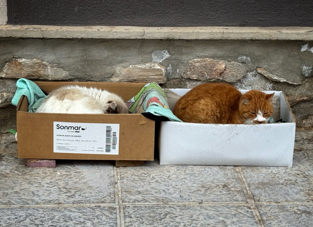 Men regnet upphörde snart och ers nåd kunde komma fram och gå ut. Fast caféet hade inte ställt ut bord och stolar utan vi fick dricka vår cortado under tak. Och katterna på torget ville inte lämna sina lådor.