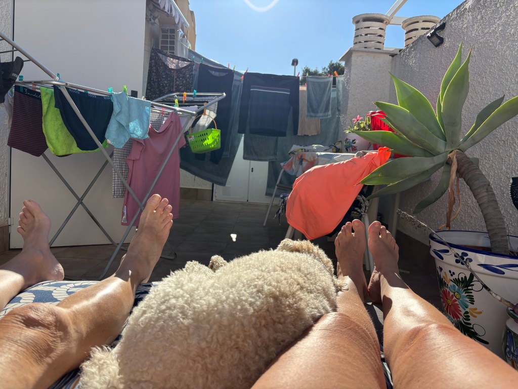 Svängning kom jag också i en morgon; Siri lekte med några större hundar i parken, alla lösa och lyckliga, och hon tänkte sladda in mellan mina ben. Jag hade farten uppe och, även om jag gick med stavarna som jag gör på morgonrundorna, föll jag så klart. Tack och lov slog jag mig inte, tyckte bara det var otroligt pinsamt när de spanska hundägarna kom framrusande och skulle hjälpa tanten upp. Mannen blev nog räddast av alla, han såg framför sig hur han skulle få plocka fram den vita rocken och ta hand om mig ett år till…