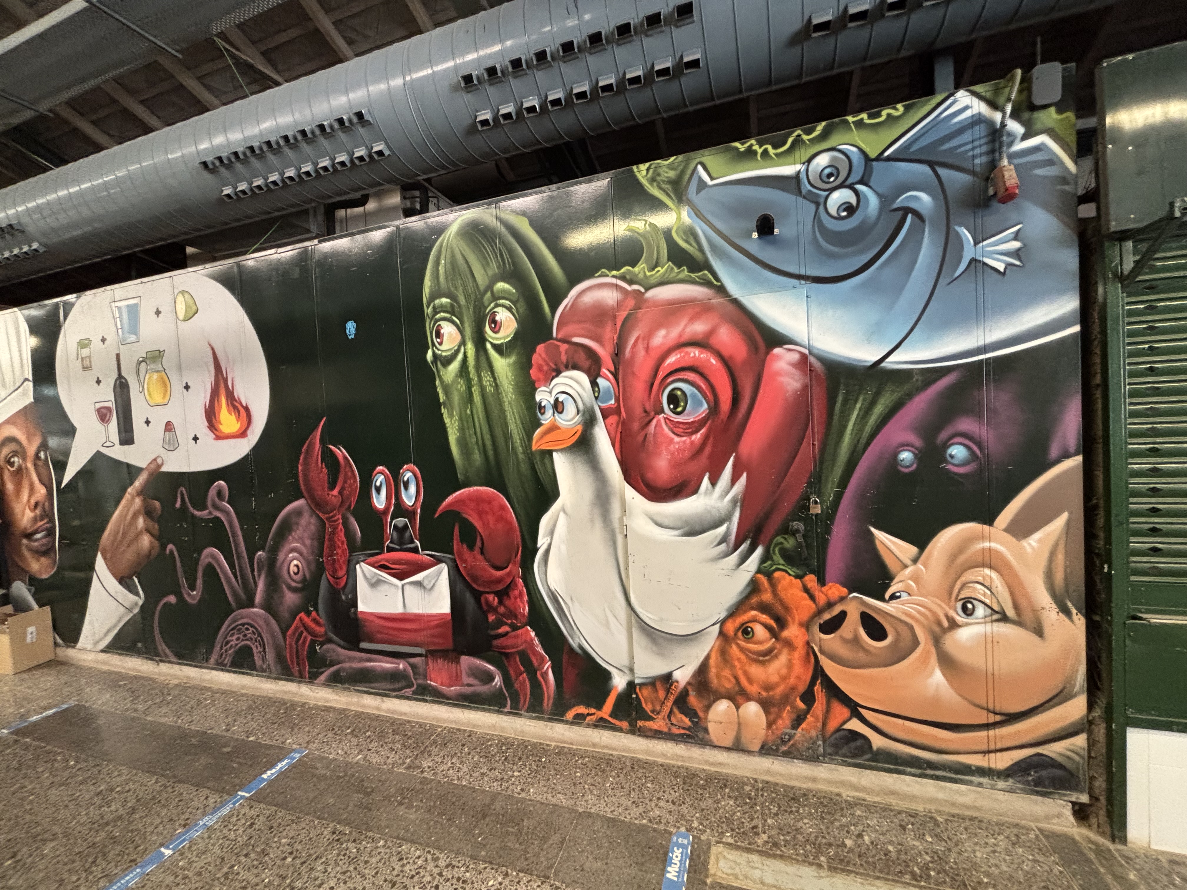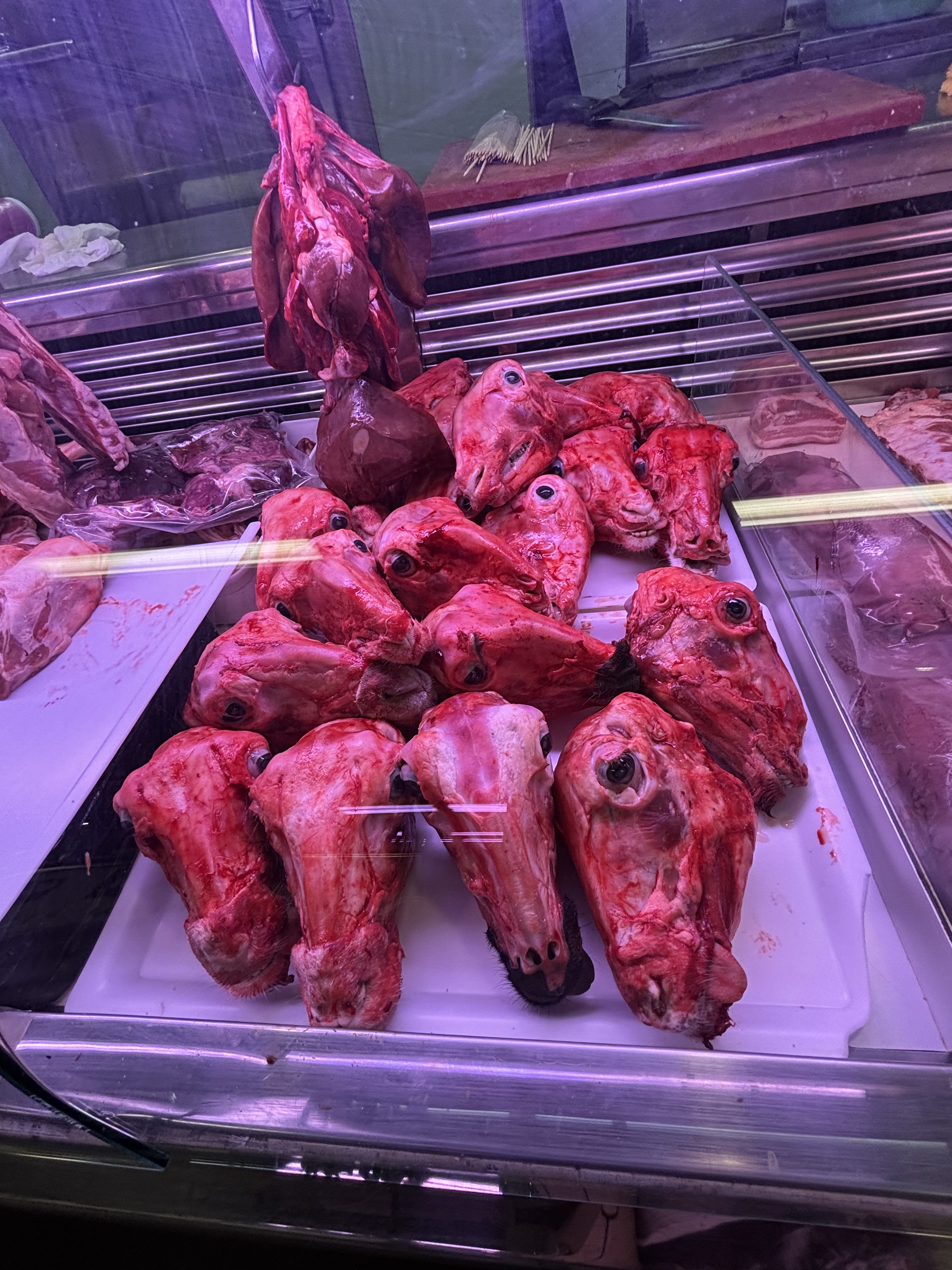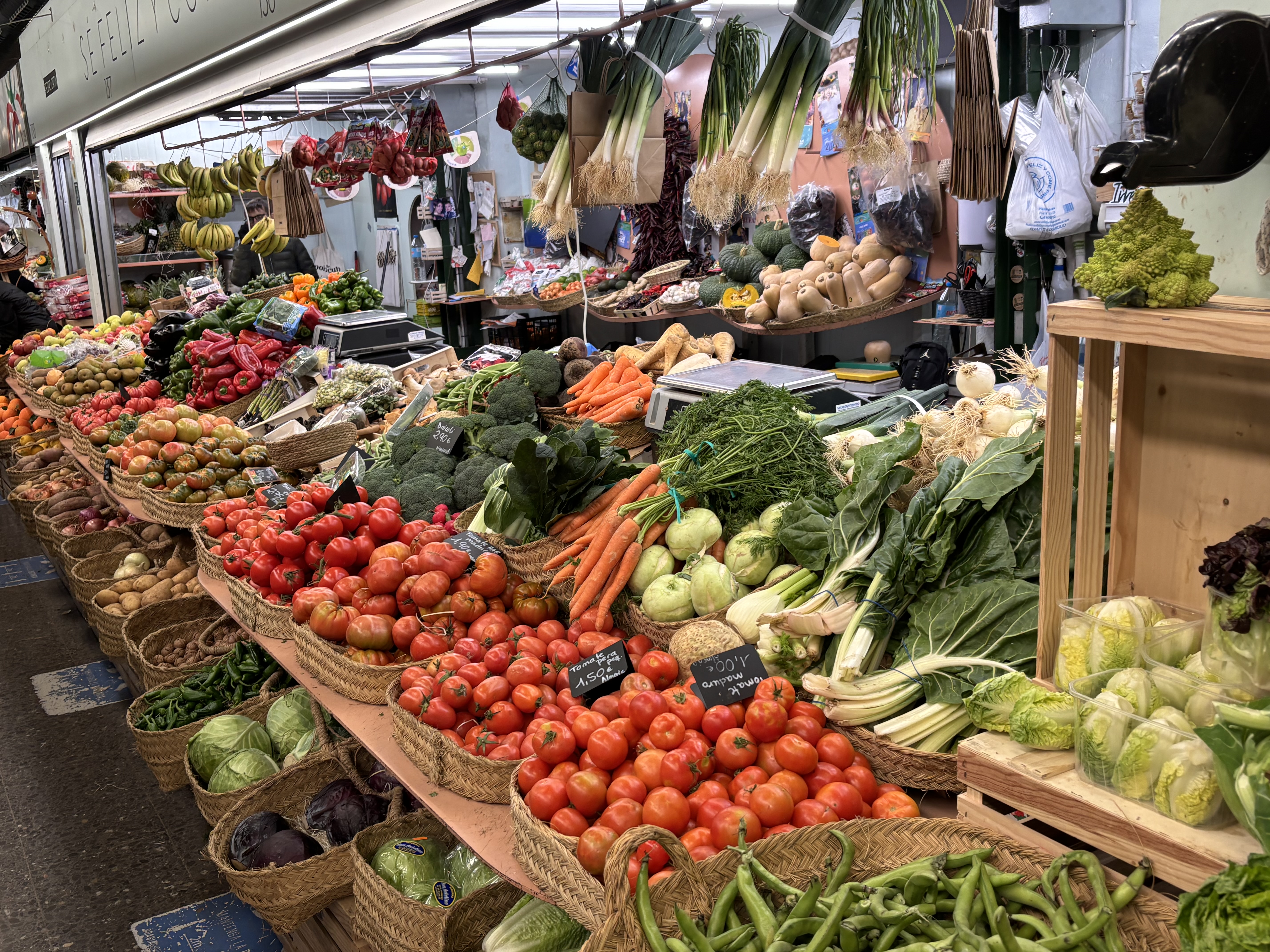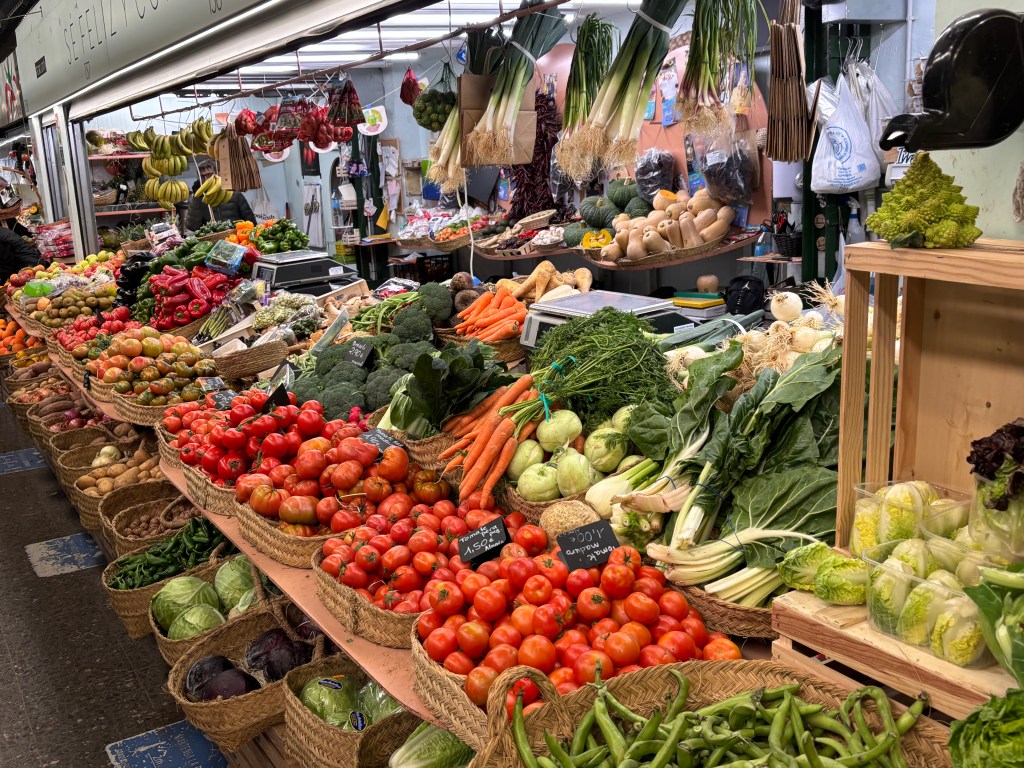 På Veronica-marknaden har man frukt och grönt en trappa upp, och kött, fågel och fisk där nere. Mycket såg gott ut, men kanske inte de flådda kaninerna eller fårskallarna som blängde på oss.