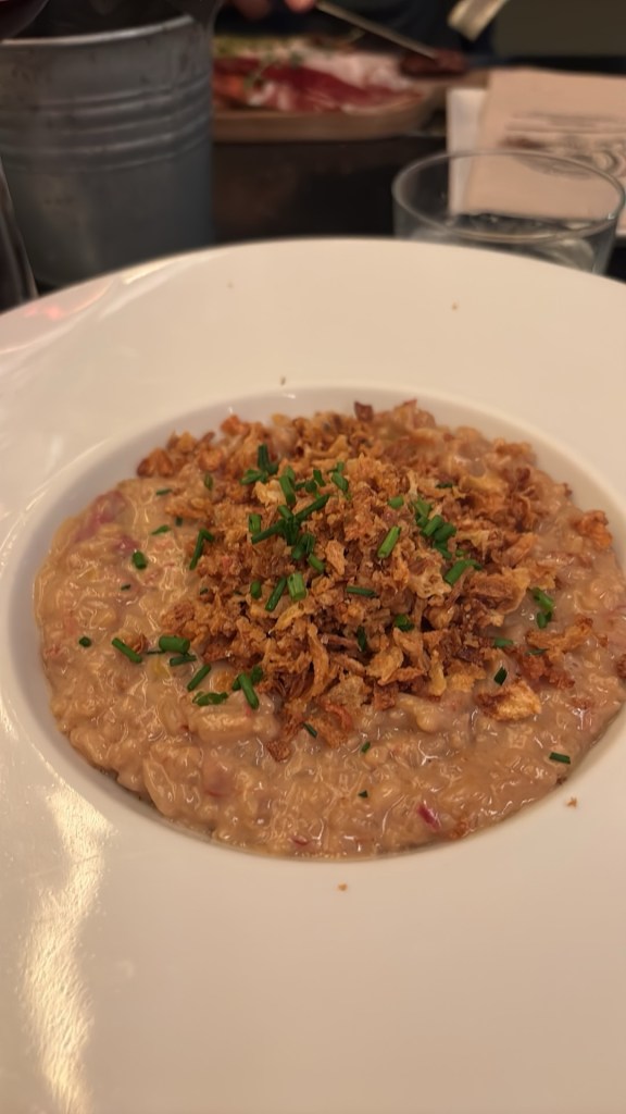 Det var tur att den var så god, för det var inte middagen. Ok, morötterna och hummusen som förrätt var ett säkert kort, men risotton med anka och krispig lök var en brun, smaklös sörja med spår av anka täckt med rostad lök. Hälften ut och ingen dricks.