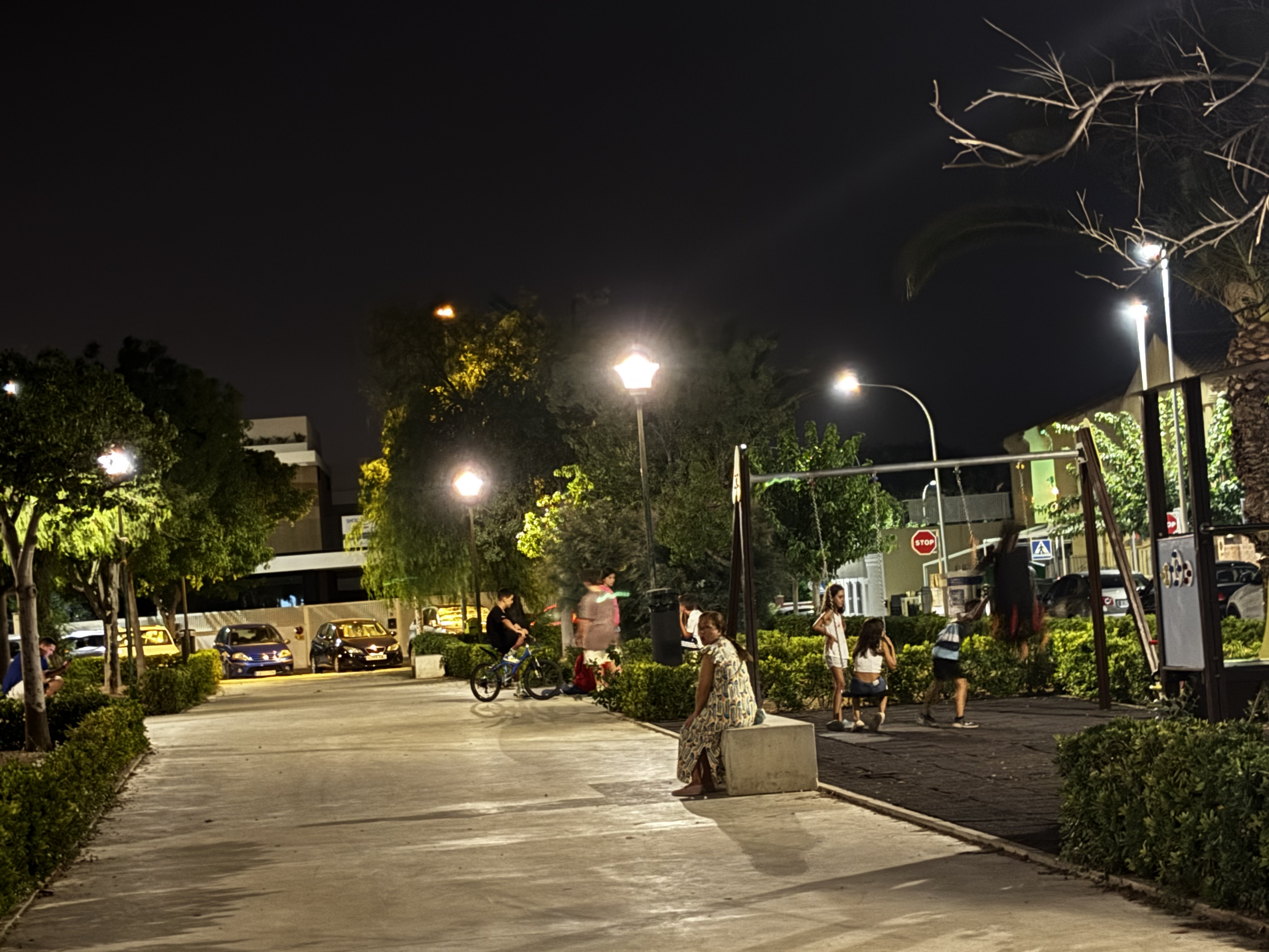 Klockan 22.30 på kvällen hade det svalnat av till 32 grader och vi insåg att vi behövde både luft och annan motion än den städningen ger och tog en promenad. Augusti är spanjorernas semestermånad och varenda hus här är bebott nu, (utom våra engelska grannar som förmodligen åkt till England) Vi gick genom den spanskare delen av byn och överallt satt man ute, i trädgårdar, parker och på gatorna. Lekplatserna var fulla med barn som hållits inne hela dagen och behövde spralla av sig. Vi stannade till på torget och fyllde på vätskebalansen och var nog de enda icke-spanjorerna där. Inget ont om våra svenska vänner på orten, men helt plötsligt var vi i Spanien på riktigt! Och när vi gick hem fram mot midnatt var fortfarande de spanska familjerna i alla åldrar ute.
