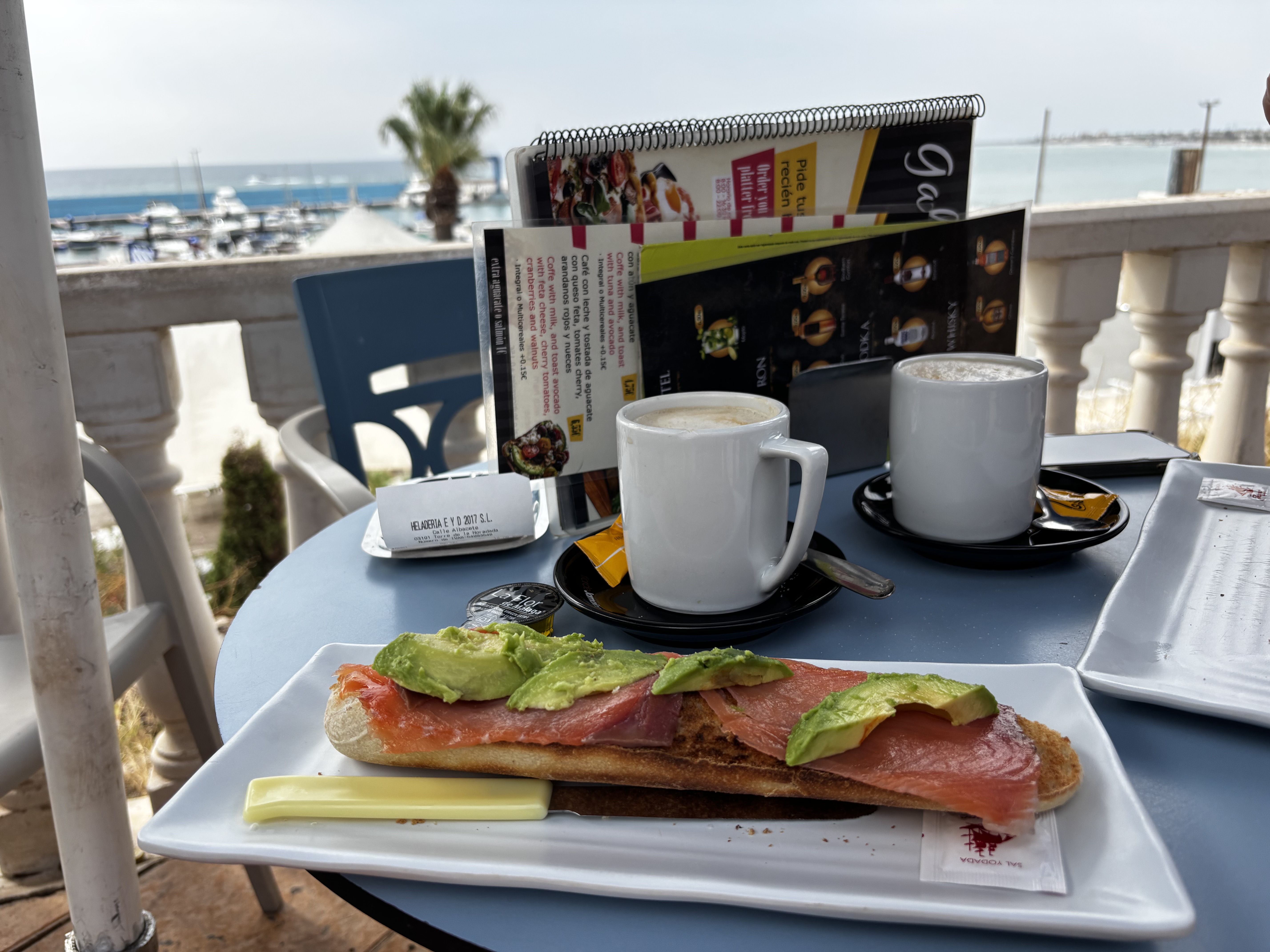Så gick jag tvärs över gatan och träffade Mannen på Las Brisas där vi bokat bord. Vi har varit där förr, och deras mat är fantastisk. Det var den i förrgår också, vi delade först på två förrätter, räkor i het sås och calamares, och valde sedan ”Rodaballo al estilo Las Brisas, (piggvar efter deras recept), allt utsökt gott! Däremot hade nog inte töserna i servisen gått någon restaurangskola, ävan om de var söta och vänliga. När vi frågade efter vinlistan kom hon in med en flaska Verdejo och undrade vem som ville testa. Den var helt OK, men det hade kanske funnits något annat som vi gillat bättre? Än värre var att de kom in med huvudrätten innan vi hade avslutar förrätten (samma sak till bordet bredvid), så det var att välja skippa calamares och räkor eller låta piggvaren svalna.